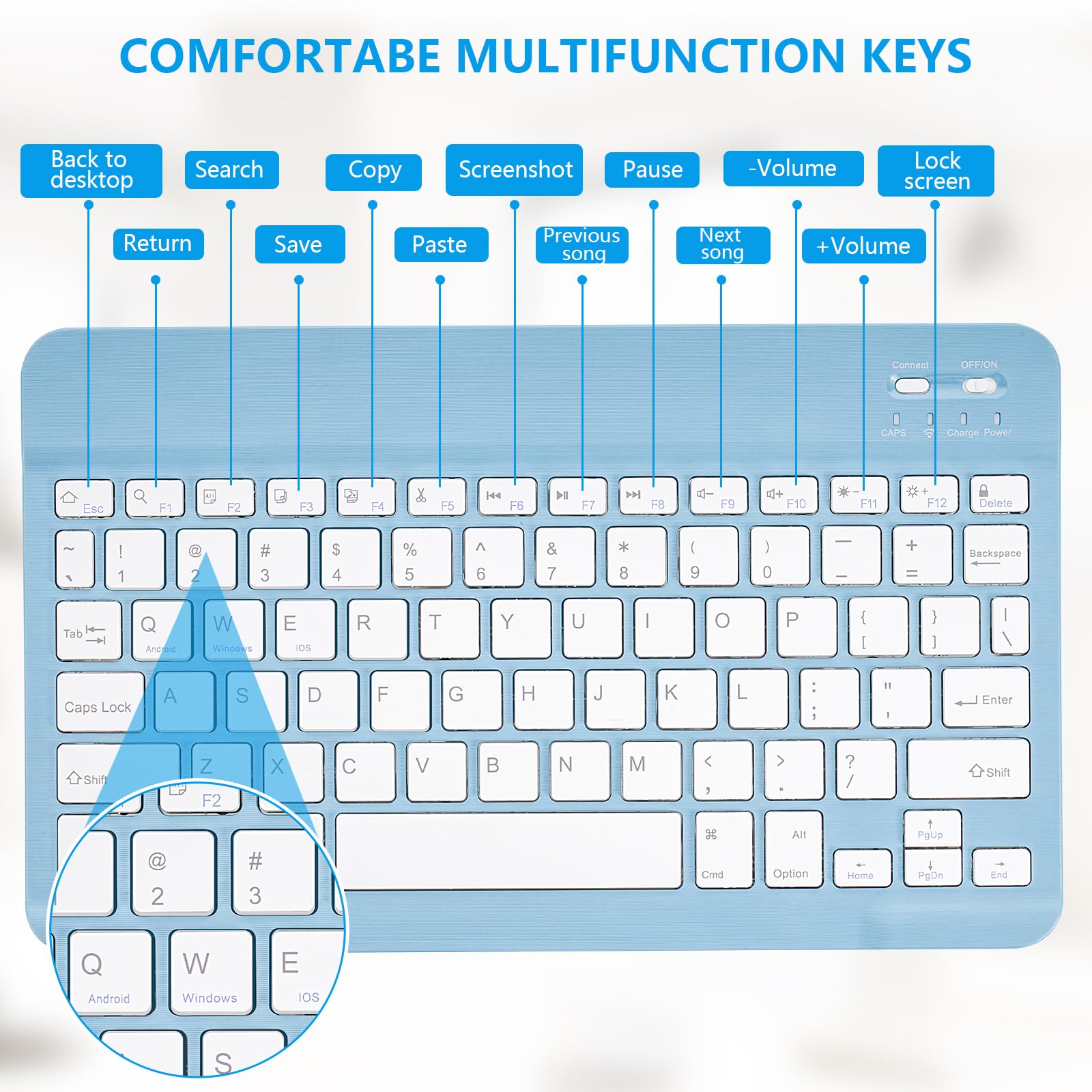 Grâce au câble USB-C inclus, 30 jours d'utilisation continue ou 120 jours en mode veille après une charge complète. Connexion sans fil La connexion sans fil avec vos appareils mobiles tels que tablettes et smartphones offre plus de confort lors de la frappe et une portée jusqu'à 10 m. Conception ergonomique à faible arc S'adapte mieux à votre paume et soulage efficacement la fatigue des mains après une utilisation à long terme. 【Touches confortables】 Pieds en ciseaux stables sous chaque touche, qui est lisse, rebondit rapidement, sans se coincer ou faire de bruit, vous offrant une expérience de frappe extrêmement confortable. Il suffit d'appuyer sur l'interrupteur et de glisser le curseur, pour connecter l'appareil avec succès. Clavier Portable Ultra Mince Clavier Bluetooth Sans Fil Avec Souris - Mini Ultra Fin Pour Ipad, Mac Clavier Sans Fil (Ne prend pas en charge le Win 8) En outre, appuyez simultanément sur « Fn + Win », « Fn + Android », « Fn + iOS » sur le clavier pour basculer rapidement entre les trois modes. (Win 8 n'est pas pris en charge., ) Parfait pour tous ceux qui ont besoin d'un clavier portable pour travailler ou jouer., Poids : 185 g Clavier sans fil : retrouvez notre sélection des meilleurs claviers bluetooth sur . Les meilleures marques au meilleur prix. Livraison express ou retrait rapide en magasin Le design fin et léger vous permet de le mettre dans votre poche, idéal pour les voyages d'affaires et les études en plein air, laissez vos doigts profiter d'une merveilleuse expérience de frappe. Caractéristiques: Matériaux : plastique, métal , Taille: 24., 5x15x0., 6cm/9., 6x5., 9x0., 2in , Poids : 185 g / 6,52 oz Le design ultra fin et super léger vous permet de le mettre dans le sac à dos, le sac d'ordinateur, la valise, à transporter partout où vous le souhaitez, ne prendra pas de place et n'ajoute pas de poids supplémentaire. Grande compatibilité Prend en charge les tablettes, ordinateurs portables et téléphones portables IOS, Android et Windows, tels que le nouvel iPad 10,2 pouces, iPad Air 4 10,9 pouces, iPad Pro 12,9/11 pouces, iPhone 11/11 Pro/11 Pro Max, iPhone Xs Max / XS / X , etc. Les meilleures offres pour Clavier sans fil portable Aimmie, clavier ultra universel rechargeable1010 ... sont sur Comparez les prix et les spécificités des produits neufs et d 'occasion Pleins d 'articles en livraison gratuite Clavier pour tablette : les 6 meilleurs modèles en 2023 Prend en charge les tablettes iOS, Android et Windows, ordinateurs portables et téléphones mobiles, tels que nouvel iPad 10,2, iPad Air 4 11, iPad Pro 12,9/11, iPhone 11/11 Pro/11 Pro Max, iPhone Xs Max/XS/X, etc.