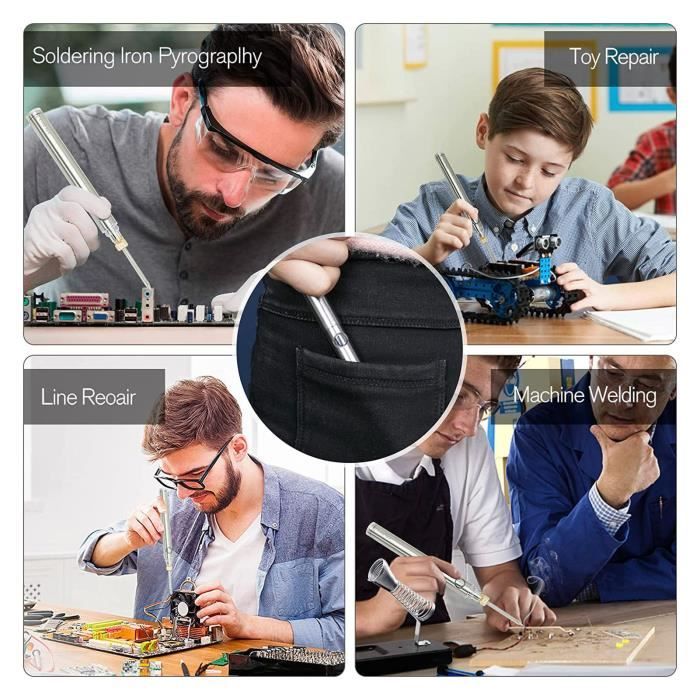 Le fer à souder sans fil peut être chargé par batterie externe ou ordinateur portable (seulement 5 V 1 A, pas de charge rapide). Sans fil et rechargeable : le kit de fer à souder sans fil a une batterie intégrée de 1400 mAh qui permet de travailler sans fil. Avec connecteur de type C en environ 2 heures de charge, il offre jusqu'à 60 minutes d'autonomie Kit de fer à souder sans fil USB avec écran LCD, batterie de fer à souder avec 3 températures réglables de 330 ℃ à 450 ℃, 3 pannes à souder, support de fer à souder, fil à souder, fer à souder professionnel et sûr Fonctionnalités: Ce fer à souder sans fil dispose d'un écran LED haute résolution pour afficher la température. Peut également être utilisé pour les travaux de soudure fins dans le modélisme. Applications polyvalentes : ce kit de fer à souder sans fil est parfait pour les réparations électroniques, les circuits imprimés, les appareils ménagers, les montres, les guitares et les bijoux. Facile à utiliser : le fer à souder sans fil s'allume en appuyant sur 5 secondes. La surface isolée thermiquement protège contre les brûlures, la poignée antidérapante en TPE assure une prise en main sûre. Facile à utiliser] Le fer à souder s'allume et s'éteint d'une simple pression de 3 secondes. Le bouton de réglage de la température vous permet de travailler plus confortablement. Une couche isolante thermique protège vos mains des brûlures.[Température réglable sur 5 niveaux] Cinq réglages de température bicolores sont disponibles. La température est réglable de 260 °C à 420... Le fer à souder sans fil est équipé d'un port USB et peut être chargé via une banque d'alimentation, un ordinateur ou un téléphone portable. Fer A Repasser Sans Fil Kit De Fer à Souder Sans Fil Portable Fer Fer à Souder Portable Rechargeable Type C Miniware Ts21 330-450°C Kit Fer à Souder Sans Fil Treedix - - Charge USB - 3 Embouts Température Réglable Fer A Souder Sans Fil Fer à Souder Sans Fil USB Rechargeable Fonction de sécurité : arrêt automatique après 10 minutes d'inactivité. Ce kit de fer à souder sans fil est parfait pour les réparations électroniques, les circuits imprimés, les appareils ménagers, les montres, les guitares et les bijoux. Kit complet : ce kit de fer à souder sans fil contient tout ce dont vous avez besoin pour une soudure précise : fer à souder sans fil, fil à souder, pâte à souder, 3 embouts, un support avec éponge de nettoyage, un câble de type C et des instructions (français non garanti). Sans fil et rechargeable : le fer à souder sans fil a une batterie intégrée de 1000 mAh qui permet de travailler sans fil. Avec connecteur de type C en environ 2 heures de charge, il offre jusqu'à 30 minutes d'autonomie.