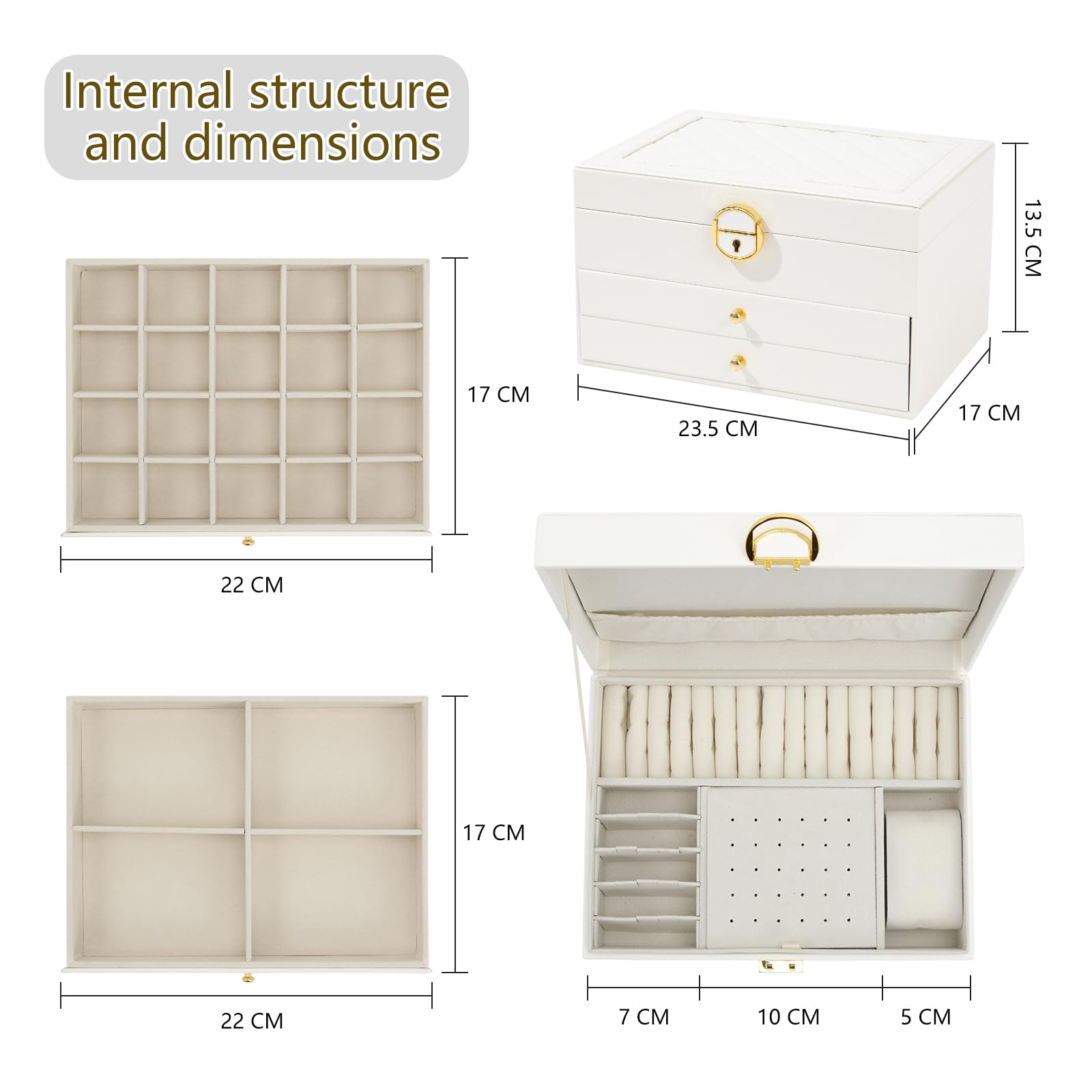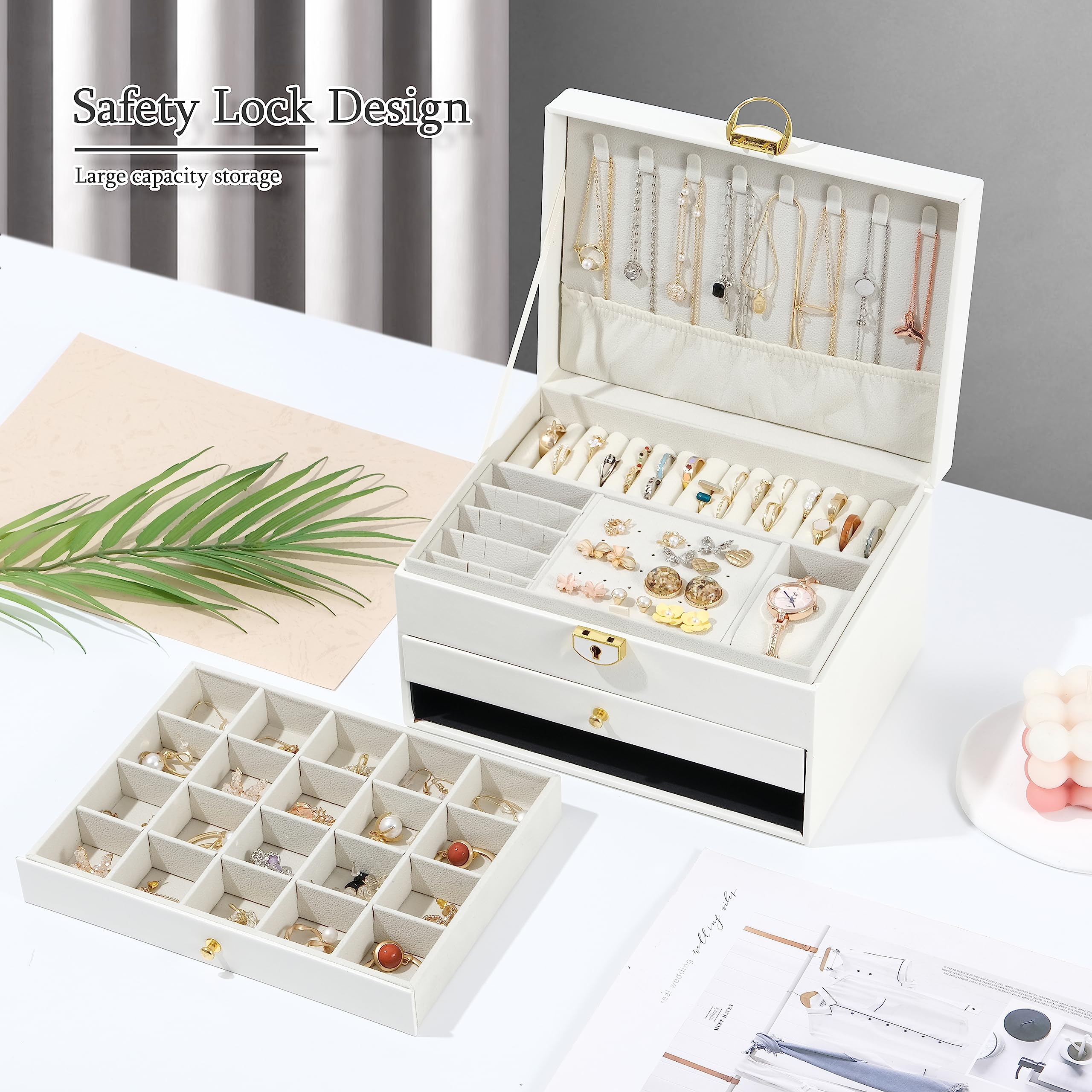 La boîte protège vos bijoux de la poussière, des traces de doigts, des rayures, des dommages et du vol. Chaque fille ou femme aime son beau look et son design attentionné. Permet d'économiser de l'espace de rangement dans votre tiroir ou votre commode. Utilisation : cette boîte à bijoux en acrylique transparent est spécialement conçue pour et les femmes, avec un design élégant, bien faite et , la boîte à bijoux est adaptée pour les colliers, boucles d'oreilles, bagues, bracelets, montres ou pinces à cheveux, organiseurs, photos, billets, reçus, cartes ou autres bibelots. Application : il est très approprié pour présenter des colliers et bracelets de haute qualité dans la vitrine avant des magasins de détail ou à la maison. Boîte de rangement à bijoux en bois pour femme - 3 tiroirs La coque en acrylique transparent protège vos précieux bijoux de la poussière, de l'humidité et des rayures, et il est facile de nettoyer la boîte avec le chiffon humide. Plateau doux en velours : chaque tiroir à l'intérieur de la boîte à bijoux est équipé d'une doublure en velours pour fournir une protection complète pour vos précieux bijoux. Qualité exceptionnelle : cette boîte à bijoux est fabriquée en simili cuir de haute qualité et doublée de velours beige, le look attrayant est durable qui peut protéger vos bijoux de la poussière et des rayures Boîte Cadeau Femme élégante MOTTK Boîte à Bijoux Pour Femme Avec 3 Tiroirs, Boîtes De Rangement Présentoir Bijoux 3 Tiroirs Qualité : la boîte à bijoux et les organiseurs sont fabriqués en verre acrylique transparent de qualité avec un intérieur en velours doux. Ce sera un cadeau de Noël ou d'anniversaire, de Saint-Valentin, de fête des mères, de Thanksgiving et de cadeau pour femme pour le quotidien. Cette Boîte à Bijoux avec Tiroirs est le rangement idéal pour votre collection de bijoux. Pour faire simple, ce modèle a littéralement tout ce que vous recherchez lorsque vous voulez acheter une boîte à bijoux moderne Matériau : acrylique et velours. Rangez facilement différentes tailles de bijoux, tels que bagues, boucles d'oreilles, colliers, bracelets, etc. Cette boîte à bijoux garde vos bijoux organisés et en sécurité. Pour mariage, Noël, anniversaire, fête des mères, Saint-Valentin, mère, épouse, petite amie, fille, amie ou même la mariée.