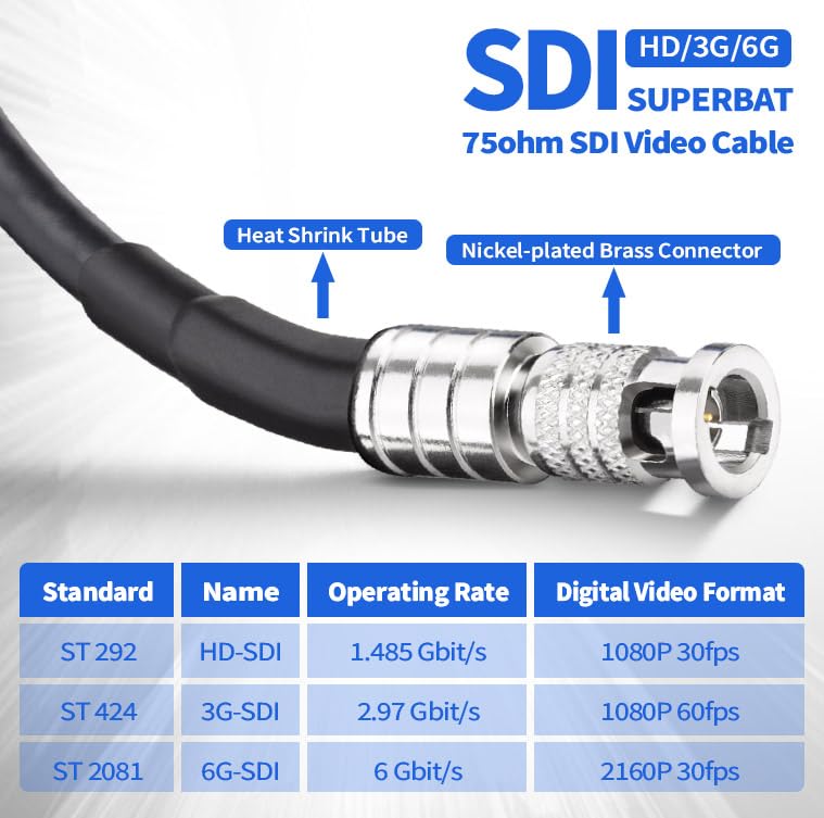 Superbat Câble SDI BNC Coudé 30cm 3G/6G/12G 75 ohms Cordon BNC Double Mâle à Angle Droit Câble RG6 pour Blackmagic Vidéo DVR Oscilloscopes Caméras de Surveillance CCTV (2 pièces Connecteur HD BNC Miniature : Adoptant une conception de connecteur miniature, compacte, la connexion à baïonnette assure une fixation sûre et solide, adaptée aux équipements à haute densité. Connecteur BNC Femelle HD BNC Micro Mâle Superbat Câble BNC 3G/HD SDI 75Ohm RG179 Câble Vidéo SDI 30cm Bnc Male A Souder Specification: Type de Câble : Belden 1855A ; Type de Connecteurs : BNC Femelle to HD BNC Micro Mâle 90°; Connecteurs : dorés ; Impédance : 75 ohms ; Longueur : 30cm ; Emballage : 1 X câble HD BNC. En cas de réception d'un produit défectueux, veuillez nous contacter et nous le remplacerons rapidement pour vous. Entre-temps, nous offrons également un service personnalisé, nous pouvons vous fournir des câbles de la longueur, spécification et couleur dont vous avez besoin. Adaptateur BNC Male vers BNC femelle coudé HangTon Câble vidéo 6G SDI HD Micro BNC vers BNC femelle pour moniteur Blackmagic Video Assist 5 (1 m Gainage en PVC flexible, résistant aux UV et au vieillissement, idéal pour une utilisation en extérieur ou en milieu industriel. Service: Ne vous inquiétez pas pour la sécurité, nous avons confiance en la qualité de nos câbles et offrons une garantie d'un an sur nos produits. Câble Belden 1855A : Conçu avec un conducteur en cuivre nu à haute conductivité pour une transmission stable des signaux haute fréquence et une réduction des pertes.