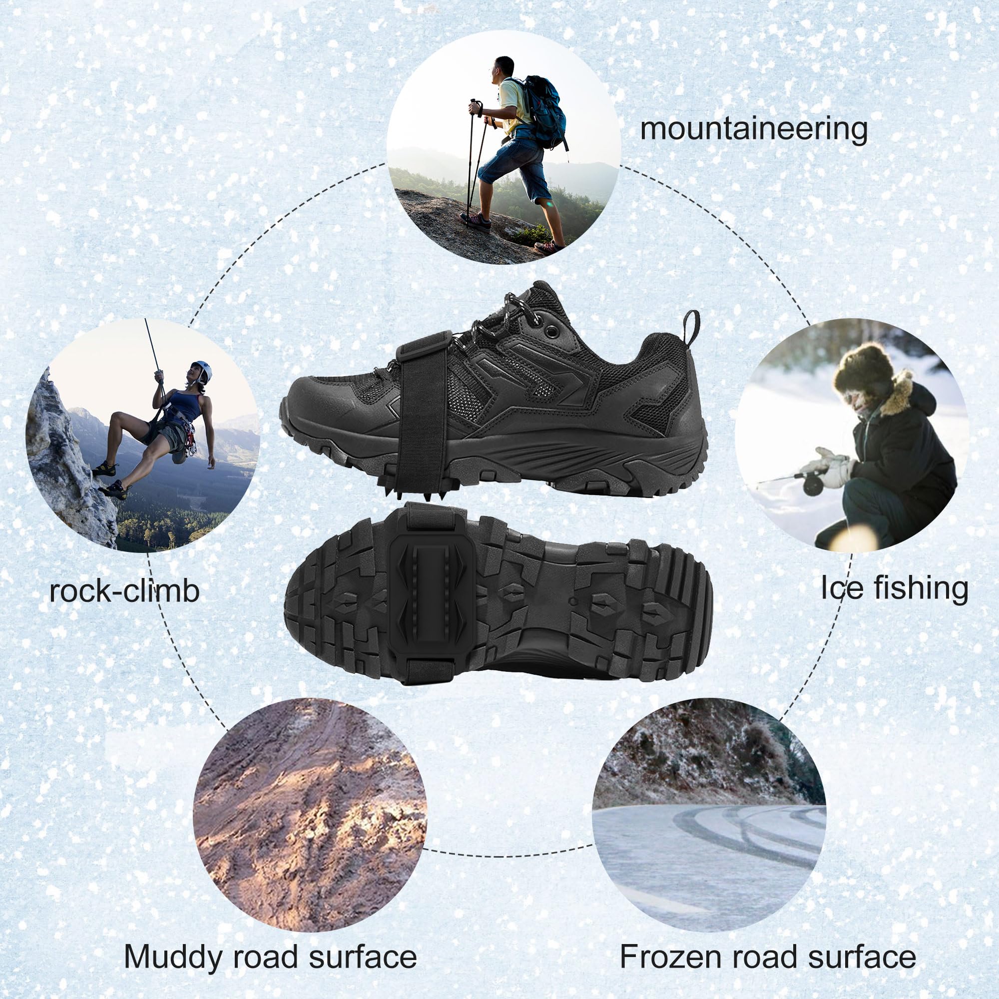 Matériau durable et élastique] Fabriqués en caoutchouc de haute qualité, ces Crampon Antidérapent sont plus résistants que le TPE, assurant des performances élevées jusqu'à -45°C sans se déchirer ni se casser 【Antidérapant et anti-chute】Les crampons sont équipés de 8 clous en acier inoxydable robuste de haute qualité qui augmentent la surface combinée des clous en acier et du gel de silice afin d'empêcher les clous de tomber. Crampons Neige Decathlon Crampon Chaussures Neige 2 Paires Crampons - Antidérapant Sur Chaussures/Bottes Clous Crampon Anti Verglas Trail Decathlon Convient aux hommes et aux femmes de tous âges, adolescents, adultes, personnes âgées. 【Taille universelle】Ces crampons de taille L (41 - 46 ) conviennent à différents types de chaussures de plein air, telles que les chaussures de randonnée, les chaussures de loisirs, les bottes, etc. 【Facile à utiliser】Attachez la pointe du crampon à la pointe de la chaussure, puis tirez la queue sur le talon, très facile à enfiler et à retirer. Ils sont parfaitement adaptés aux activités de plein air telles que la randonnée sur des terrains inclinés, sur des routes ou des voies d'accès verglacées... Griffes de neige coordonnantes pour l'escalade, crampons à 10 crampons, couvre-chaussures de sport, équipement de ski antidérapant Spécifications: Matériau: caoutchouc TPE + acier inoxydable 304 Taille: L (EU : 41-46) Liste de colisage: 2 paires de crampons Des crampons de traction stratégiquement placés assurent une répartition uniforme du poids et empêchent les glissades et les chutes sur la glace, la neige et les trottoirs mouillés. Veuillez vérifier les dimensions avant l'achat.
