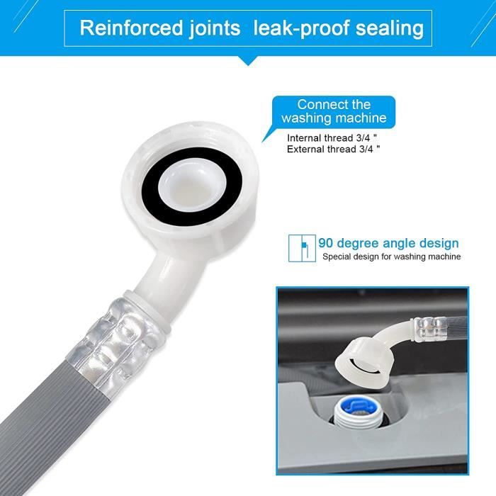 Pression d’éclatement max., : 60 bars. FLEXIBLE ALIMENTATION Droit/Coudé 2 M. | Leroy Merlin Notre tuyau d'alimentation coudé est la solution idéale pour brancher facilement votre machine à laver ou votre lave-vaisselle. Grâce à sa construction robuste et ses raccords coudés pratiques, il permet une installation simple, même dans les endroits difficiles d'accès Chaque extrémité du tuyau d’alimentation en eau est équipée d’un joint en caoutchouc et est donc prêt à être raccordé. Le tuyau d’alimentation en eau a une pression maximale de service de 10 bars et une pression d’éclatement de 60 bars. Le tuyau d'alimentation vous permettra de raccorder facilement votre machine à laver à l'arrivée d'eau. Compatible avec toutes les marques courantes de machine à laver, lave-linge et lave vaisselle. Ne pas monter sur l'eau chaude. Flexible d'alimentation universel pour machine à laver. Raccords droits Femelle-Femelle coudé 3/4. Longueur : 2,5 mètres. Pression maxi d'utilisation : 4... Raccords vissés : Filetage intérieur 3/4 (26 mm)., Pression de servicemax., 10 bars. Le tuyau de raccordement a d'un côté un raccord coudé pour le raccordement à la machine à laver ou au lave vaisselle et de l'autre côté un raccord pour le raccordement à une soupape ou à un robinet d’eau avec un filetage de 3/4 (26 mm). Tuyau D'alimentation En Eau Pour Machine à Laver, Rallonge De Tuyau Pour Lave Vaisselle Tuyau Darrivee Deau Pour Lave Vaisselle A Angle De 34 Tuyau Darrivee Deau Universel Pour Machines A Lave 78389202