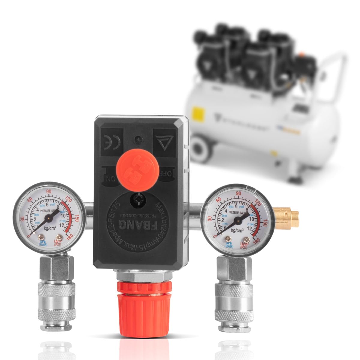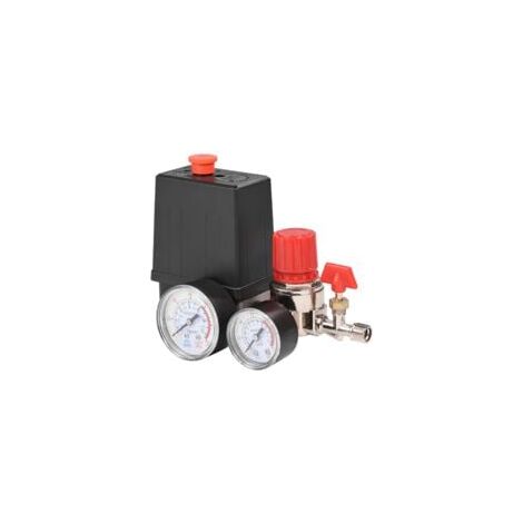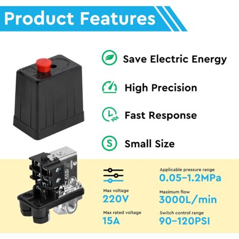 KUNSE 220V 1/4Inch Bsp 4 Port Monophasé Compresseur d'air Pressostat Pressostat Compresseur Air 220V WDKXCN Pressostat Compresseur Dair, 220V Regulateur De Piece Pour Compresseur Regulateur de Pression Dair Compresseur Facile à installer, plug-and-play, s'intègre rapidement dans les appareils existants sans modifications compliquées Caractéristiques 1., Pressostat Compresseur d'un orifice de trop-plein pour ajuster avec précision la demande de gaz et aider efficacement le compresseur d'air à économiser de l'énergie., 2., Compresseur régulateur de pression Haute précision, vitesse de réponse rapide de la pompe de réduction de pression, bonnes performances d'étanchéité du compresseur d'air, réponse sensible aux changements de tension, assurant un fonctionnement stable., 3., Pressostat Négatif La pression d'ouverture et de fermeture du compresseur peut être réglée selon les besoins dans la plage de 5,0 à 8,0 bar 4., Pressostat Compresseurd'air Facile à installer, extrêmement pratique pour une utilisation quotidienne. Contenu Du Kit : Le Pressostat Compresseur Dair contient un pressostat, deux manomètres de haute précision, une vanne de régulation et une soupape de sécurité pour une régulation complète de la pression Manomètre Avec Distributeur Pressostat Complet avec Soupape De Sécurité et Manomètre 1/4" 12 Bar Surveillance Précise en Temps Réel : Pressostat Compresseur Dair deux manomètres intégrés affichent simultanément la pression de travail et la pression du réservoir, avec une précision bien supérieure à celle des produits similaires. Compresseur dair Pressostat triphase Vanne de controle avec regulateur dair Largement Compatible et Adaptable : Pressostat Compresseur Dair Conception de filetage G1/4 innovante, connexion transparente à la plupart des compresseurs d'air, outils et systèmes pneumatiques. Processus d'installation Comme le montre la vidéo spécification Matériau : métal + plastique Poids : 610 g Taille de connexion : 12 mm Plage de pression de commutation : 0,5–0,8 MPa Courant maximal : 20 A Diamètre extérieur du raccord de décharge de pression : 9,5 mm Débit maximal : 180 PSI Emballage inclus 1 x Pressostat Compresseur Dair 2 x manomètres