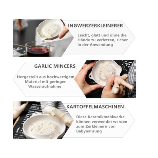 Cette action ciblée permet un râpage rapide et une texture parfaite sans effort supplémentaire. Fabriquée dans un matériau céramique premium, elle résiste aux chocs accidentels et conserve ses performances intactes après des années d'utilisation intensive. L'ergonomie a été méticuleusement étudiée : la surface laquée ultra-lisse offre une prise en main confortable et sécurisée, même avec les doigts humides. Amplifie naturellement les arômes pour parfaire vos plats avec une touche finale gastronomique authentique. Cet ensemble intelligent répond parfaitement à toutes vos préparations culinaires quotidiennes. Naturally Med Râpe à ail (râpe à ail, éplucheur en silicone, brosse Cette amplification sensorielle apporte une touche finale raffinée à vos plats, transformant les préparations simples en expériences gastronomiques mémorables grâce à une authenticité préservée. Qu'il s'agisse de préparations familiales, de compléments alimentaires santé, de spécialités japonaises authentiques ou de créations gastronomiques élaborées, cette râpe excelle dans le traitement des fruits, légumes et aromates. Elle offre une faible conductivité thermique et est résistante à l'acide et à la rouille, garantissant une utilisation durable et sûre.Nettoyage et Rangement Faciles: Grâce à sa conception en céramique lisse, cette râpe est extrêmement facile à nettoyer, que ce soit à la main ou au lave-vaisselle Râpe Gingembre Ail Citron TURBO PRODUKTE Ensemble De Râpe En Céramique Avec éplucheur Et Brosse, Idéal Pour L'ail, Le Gingembre Et Les Citrons, Lavable Au Lave-vaisselle, 1 Pièce Kit Râpe Brosse Nettoyage Les dents techniques calibrées travaillent avec précision pour extraire les cellules aromatiques du gingembre, de l'ail ou des fruits tout en retenant efficacement les fibres indésirables. Son entretien simplissime - un simple rinçage suffit - garantit des résultats toujours impeccables sans altération de ses propriétés techniques. Principaux points forts · Couleur. Savons · Matériau. Céramique · Marque. NOXYZA · Forme. Rectangulaire · Peut passer au lave-vaisselle. Oui · Fabricant. NOXYZA Notre kit complet inclut trois éléments essentiels : une râpe en céramique blanche aux dimensions optimisées (11,1 cm de longueur × 9,2 cm de largeur × 2 cm d'épaisseur), un éplucheur d'ail spécialement conçu pour un décorticage rapide et efficace, et une brosse de nettoyage à poils doux permettant d'éliminer instantanément les résidus des micro-cavités. La céramique révèle le plein potentiel des saveurs : sa micro-dentelure préserve l'intégrité des composés aromatiques volatils, intensifiant naturellement les profils gustatifs des ingrédients. Cette plaque de râpe en céramique de haute qualité allie robustesse et durabilité exceptionnelles. Polyvalence Culinaire Totale -Idéale pour cuisine familiale, salle à manger, compléments alimentaires ou spécialités japonaises.