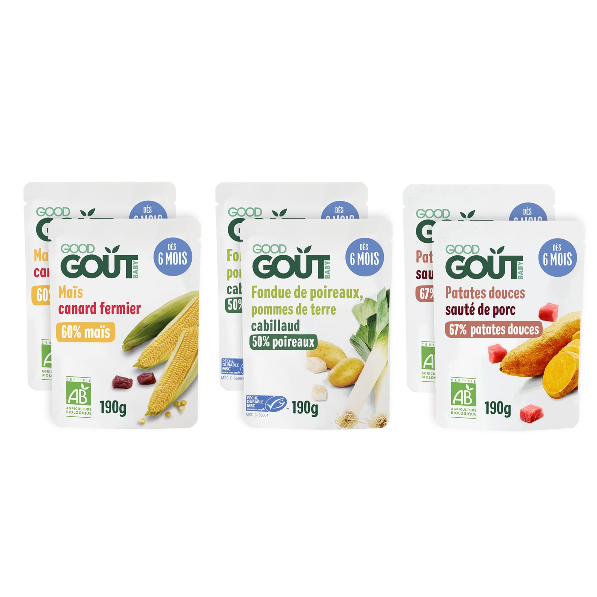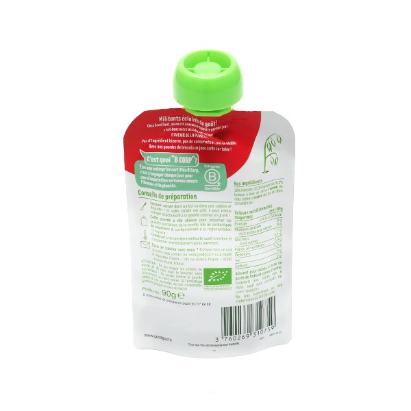 Mini Friandises 75g Canard Bio Sans Céréales | Goood France Bon à savoir :Ce sachet a été choisi pour préserver les qualités gustatives de nos recettes. Good Gout Mais Canard Babybio Petits Pots Bébé Maïs Doux Poulet Fermier Bio Dès 8 Mois Purée Bébé Maïs Canard Pour les plus pressés, versez le contenu du sachet dans une assiette ou placez-le directement au micro-ondes après ouverture. Ingrédients : 83% de bon maïs, juste ce qu'il faut de canard fermier, une pointe d'échalote et rien d'autre ! Notre sachet souple sans Bisphénol A ni phtalates nécessite une stérilisation des ingrédients beaucoup moins longue pour plus de saveurs préservées ! La Purée Maïs Canard fermier Bio Good Goût est un petit plat destiné aux bébés dès 6 mois. A l’heure de la diversification alimentaire, bébé est initié progressivement à une alimentation diversifiée GOOD GOÛT Bol Mijoté De Panais Et Chou Kale Au Saumon Bio Dès 6 Mois 2x190g P27090 Conservez à température ambiante avant ouverture et pendant 24 heures au réfrigérateur après ouverture. Plats complets pour bébés dès 6 mois , Purée 100% BIO Réchauffez pendant 30 secondes à 750 W.