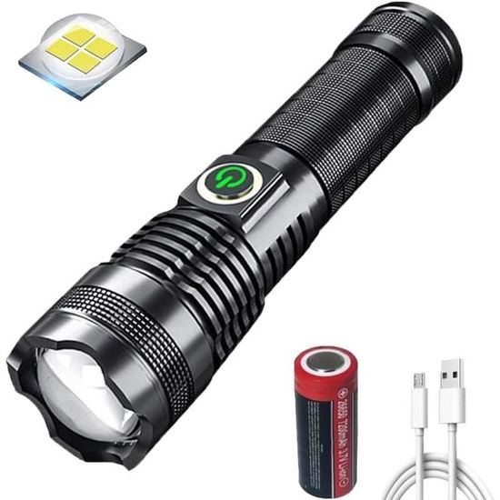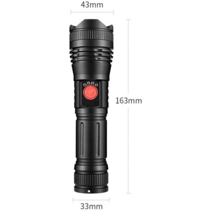 【Charge USB et indicateur de batterie】 : la lampe torche rechargeable offre jusqu'à 12 heures d'autonomie, avec une protection contre les surcharges avancée. Questions nécessitant une attention : 1., Distinguer les électrodes positives et négatives de la batterie : le côté positif est le côté saillant, tandis que le côté négatif est plat., 2., Lorsque vous installez la batterie, assurez-vous que le pôle positif est tourné vers l'intérieur et le pôle négatif vers l'extérieur., 3., Si vous devez utiliser le port de charge de la lampe de poche, nous ne recommandons pas l'utilisation d'un chargeur mural ou d'autres adaptateurs pour recharger la lampe de poche. Si vous devez utiliser un chargeur mural pour recharger la lampe de poche, assurez-vous que leur v0ltage est inférieur à 5V, sinon cela endommagera la lampe de poche., 4., Ne pas utiliser la lampe de poche pendant la charge, sinon vous endommagez la durée de vie de la batterie et une explosion accidentelle., 5., Ne pas irradier les yeux de manière directe, pour ne pas causer de dommages aux yeux. Si vous avez des questions sur la lampe de poche, contactez-nous immédiatement : nous vous fournirons un service après-vente professionnel et fiable. 【IP65 imperméable et pratique indestructible】 : la lampe torche est fabriquée en alliage d'aluminium de qualité aéronautique, résistant et anti-rouille. Lampe Torche LED Ultra Puissante, 20000 Lumens , 5 Modes Lampe De Poche Lampe Torche Rechargeable L'indicateur de batterie vous permet de surveiller clairement le niveau de charge (25%, 50%, 75%, 100%). 【Kit complet pour la lampe torche 】 : vous recevrez 1 lampe torche rechargeable, 1 câble de charge USB et 1 manuel d'instructions (français non garanti). Ne laissez pas l'obscurité entraver vos explorations : investissez aujourd'hui dans cette lampe torche et illuminez votre monde ! Il est idéal comme source de lumière d'urgence en cas de coupure de courant. Découvrez un comparatif des 6 meilleures lampes torches ultra puissantes adaptées pour des activités en pleine nature telles que le bushcraft, la chasse et la pêche Dotée d'une fonction de zoom télescopique, cette lampe de poche vous permet de concentrer le faisceau de lumière sur la zone souhaitée, aussi bien loin que de près Cette fonction offre une plus grande polyvalence, ce qui la rend parfaite pour diverses activités telles que les missions de recherche et de sauvetage, l'identification d'objectifs ou tout simplement l'éclairage du parcours lors d'une promenade en soirée., Battery installation method 1., Après la réception, veuillez démonter la lampe torche pour retirer la batterie avant, déchirer le film de protection de la batterie 2, en fonction de la batterie positive et négative installée dans la lampe de poche. En outre, il permet de mettre au point des objets distants jusqu'à 1 680 pieds (environ 3 terrains de football) ! 【Mise au point réglable et 5 modes d'éclairage】: cette lampe torche offre 5 modes d'éclairage : élevé, moyen, faible, stroboscope et SOS. Quand il s'agit de trouver la lampe de poche parfaite pour vos randonnées en plein air, notre lampe torche rechargeable avec chargement USB Type-C répond à tous vos besoins. Avec une puissance puissante jusqu'à 20 000 lumens, cette lampe torche illumine votre environnement avec une luminosité étonnante, sans laisser aucun angle inexploré LUXJUMPER Lampe torche LED super lumineuse, rechargeable, 500 000 En outre, il peut être utilisé pour charger votre téléphone en cas d'urgence.