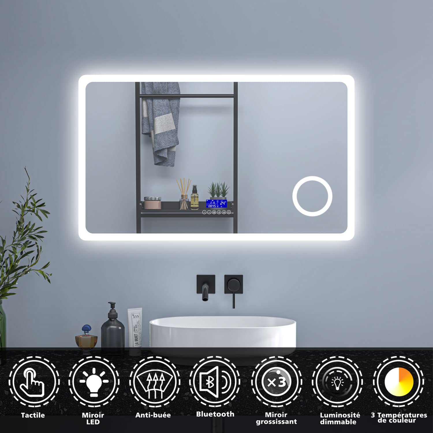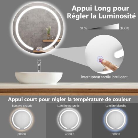 Une courte pression sur l'interrupteur tactile modifie la température de couleur en lumière blanche, chaude et jaune. Principaux points forts · Anti-buée double commande tactile miroir de salle de bain bluetooth · Miroir Description du produit HAPAOSO Miroir rond Adaptation aux occasions Par exemple, plusieurs sites tels que la salle de bains, la Chambre, le salon, etc. Maintenez l'interrupteur enfoncé pendant quelques secondes pour ajuster la luminosité souhaitée. Les accessoires d'installation sont inclus dans la livraison et sont accompagnés d'un manuel d'instructions d'installation détaillé. 【Hd & Sans Explosion】 Le miroir corps entier est clair, plus HD. étanche IP44 effet imperméable à l’eau, peut être utilisé dans les salles de bains humides. Miroir lumineux ovale l.60 x H.90cm avec Anti-buée + 3 Couleurs Économe en énergie avec une durée de vie de 50., 000 heures et un cadre en alliage d'aluminium avec une technologie originale de scellement des bords, durable et plus durable. Température de couleur réglable + luminosité Cliquez sur Smart touch pour changer de couleur blanc - jaune chaud - jaune 3000 - 6000k, appuyez longuement sur quelques secondes pour afficher la luminosité 0 - 100%. 【Spécifications】:Miroir éclairé par LED de 90x90x2,5 L x P x H (cm),Poids net:14,9kg, multicouche pour une meilleure protection. Spécifications]:Miroir 45x90x2,3cm L x P x H (cm),Poids net:6,6kg, multicouche pour une meilleure protection. · [Réglages de couleur et de luminosité] la... Miroir Rond Mural HAPAOSO Miroir De Salle De Bain 80x60cm, Miroir Grossissant 3X Avec Lumière LED, Miroir De Salle Miroir Rond LED 90 Cm Installation Facile à installer, vous pouvez facilement terminer l'installation en une quinzaine de minutes.