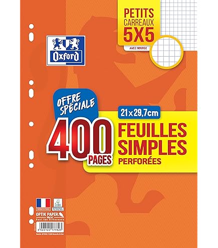 OXFORD Etui 100 copies simples 200 pages copies doubles A4 grands carreaux perforées Réglure grands carreaux Séyès, 2 couleurs pour une meilleure lisibilité ou quadrillé 5x5 margé pour une prise de notes structurées même dans les matières spécifiques. Présentées dans un étui de protection en carte, tes copies doubles resteront intactes toute l'année. Papier épais, opaque et satiné pour une écriture optimale avec tous les types de stylos: bille, feutre, roller ou plume. La réglure Seyès d'Oxford est constituée de grands carreaux violets et d'interlignes légère bleues, suffisemment visibles pour servir de guide à ton écriture... Classeur 200 Pages Oxford Copies Doubles 500 Pages A4 Perforées 90g Grands Carreaux Cahier Grands Carreaux Oxford Livré sous étuis cartonné pour plus de protection., 200 pages , Seyes