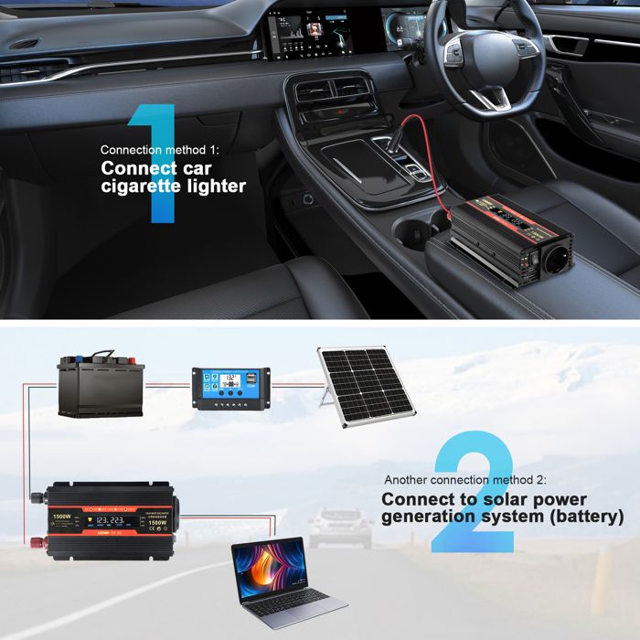 LVYUAN Convertisseur 12V 220V 230V 1500W DC à AC convertisseur de Convertisseur Onduleur 12v En 220v Convertisseur 12v 220v 1500w Convertisseur 12V Vers 220V Yinleader 1500W - Onduleur Voiture Avec LCD Et USB | Pour Camping Et Voyage Alimentation Secteur Portable Convertisseur Puissance Voiture Sinus Modifié Contactez le vendeur pour le service après-vente, le vendeur répondra dans les 24 heures. Onduleur 1500 W 12V Convertisseur 220V DC à AC, 2 Prises EU AC, 4 USB, Convertisseur de Puissance Voiture Onduleur Transformateur pour Camion, Camping, Voyage, Voitures il est largement utilisé pour tous les types d'appareils électriques consommateurs d'énergie, dont la tension est de 220V AC, tels que les téléphones portables, les ordinateurs portables, les lampes électriques, les appareils photo numériques, les téléviseurs, les lecteurs CD, les DVD, les ventilateurs électriques, etc. 1500W Convertisseur 12V 220V Pur Sinus - L'onduleur Novopal convertit la tension 12V DC en 220V/230V en ligne avec le réseau, avec une puissance continue de 1500W (capacité de surtension de 3000Watts), et comprend 2 prises Eu, 1 USB, et une télécommande filaire (5 mètres de long 【PROTECTION】 : Surcharge, court-circuit, surchauffe, inversion de polarité, sous/sur-tension, ce qui permet à l'appareil d'avoir une durée de vie plus longue. Onduleur de voiture haute puissance de 1500W avec affichage numérique, conçu pour convertir une tension de 12V / 24V DC en 220V AC. Cet appareil est idéal pour les routes, les vacances, les campings, les chantiers isolés ou partout où une alimentation secteur est nécessaire 【2 écrans LED】L'écran double LED affiche la tension d'entrée de la batterie, la tension de sortie de l'onduleur. 【APPLICATION】 : Il peut être connecté à une voiture/batterie/solaire, etc.