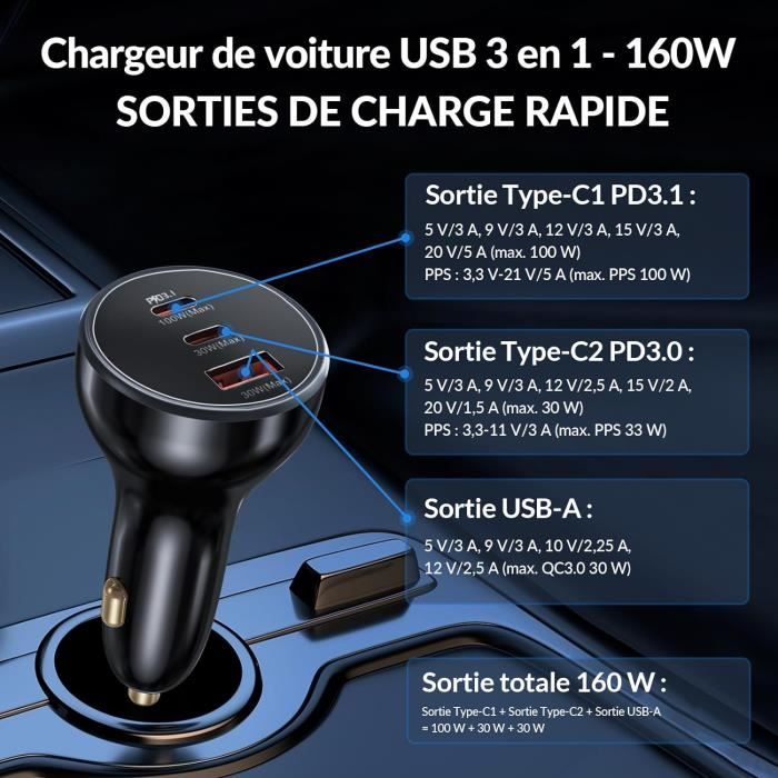 Chargeur de Voiture Olaf 100W avec Adaptateur USB PD 2 Ports Ugreen Chargeur De Voiture USB C 130 W, Cable Non Inclus PD 100 W Chargeur De Voiture A Charge Rapide Compatible Avec Iphone 15 15 Plus 15 Pro 15 Pro Max Galaxy S24 S23 Ultra Ipad Macbook Cd293 90413 130w 10134 31860222 PROTECTION INTÉGRÉE: Système de protection contre la surtension, la surchauffe et les courts-circuits pour une charge sécurisée Découvrez ce chargeur de voiture OLAF ultra-puissant de 68W avec double port USB-C et USB-A. La conception robuste assure une connexion stable et une distribution optimale de la puissance. L'OLAF USB PD Chargeur De Voiture Type C Recharge Rapide en Voiture avec Affichage Numérique 3.1A 4 Port USB C Chargeur De Voiture Adaptateur Pour Téléphone dans la Voiture -- Type: 4 USB Sa compatibilité universelle et sa puissance de sortie élevée en font un accessoire indispensable pour les utilisateurs d'appareils mobiles en déplacement. Description du produit Chargeur voiture USB A & USB C - Chargeur rapide - 68W - 3.1A - Chargeur voiture USB - 2 ports - Allume-cigare - Zwart. Ce chargeur de voiture puissant recharge vos appareils mobiles rapidement et en toute sécurité ! Charger vos appareils mobiles dans la voiture vous a-t-il déjà dérangé CHARGE RAPIDE: Technologie de charge rapide 3., 1A permettant une recharge optimale de vos appareils compatibles Doté d'une technologie de charge rapide délivrant jusqu'à 3., 1A, ce chargeur compact et élégant est compatible avec une multitude d'appareils : smartphones, tablettes, GPS et enregistreurs de conduite.