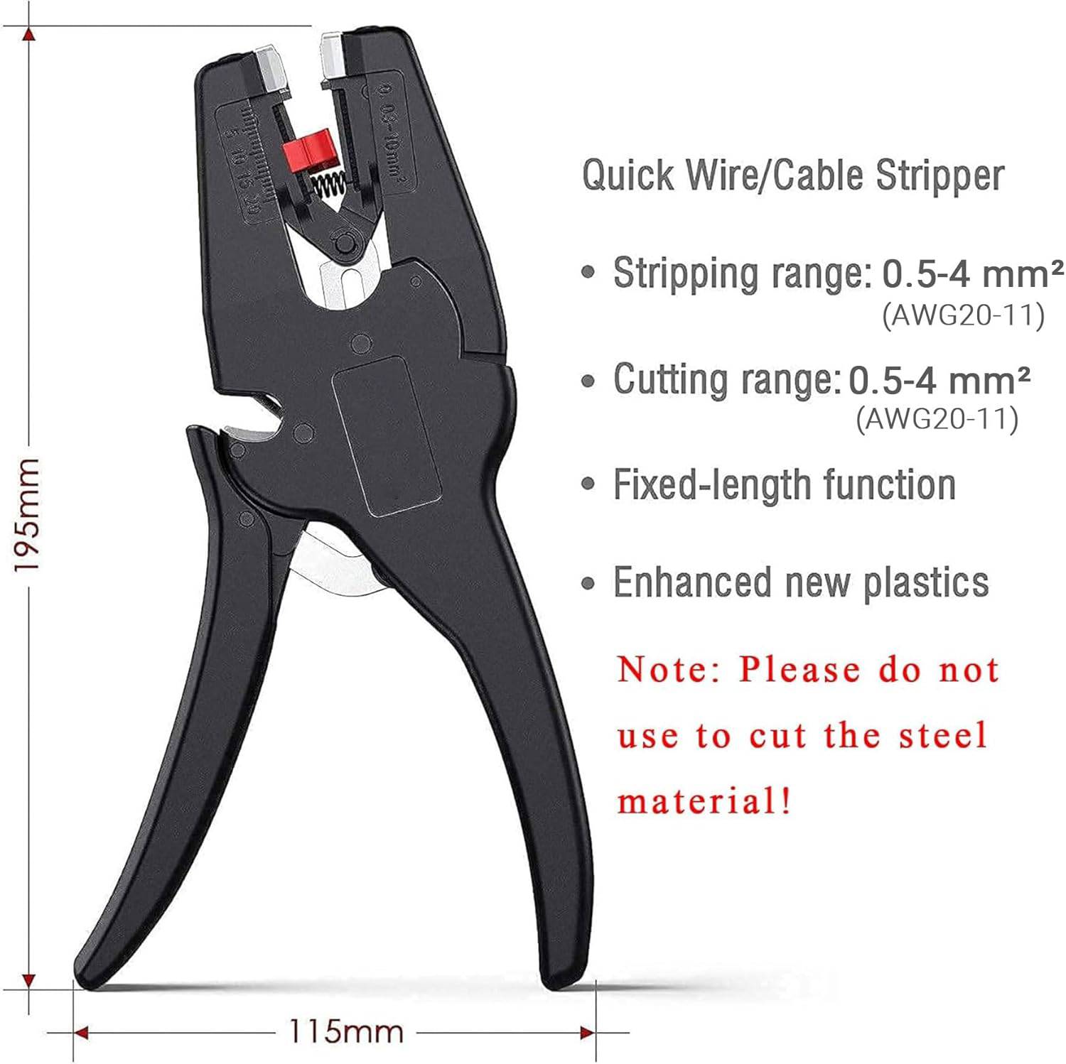 Pince a denuder automatique pour cables de 1.0 a 3.2 mm2 La conception spéciale et l'usinage précis peuvent tenir fermement et couper le fil facilement. Pince Dénudage 0-15mm Dénudeuse De Fils, Machine à Couper Et Dénuder De Fils - Tous Les Pince Dénuder Cuivre Aluminium Spécification : Type d'élément : Pince à dénuder Modèle : FS D4 Matériau : ABS Plage de dénudage : 0,08- Isolation en plastique ou en caoutchouc de 10 mm² (AWG 7 26) pour fil monobrin ou multibrin. Idéal pour une utilisation industrielle et quotidienne. Ajustement automatique : Pince à dénuder et coupe-fil avec réglage automatique des mâchoires pour dénuder le fil. Avec une capacité de section maximale de 8 mm², une longueur de coupe jusqu'à 100 000 mm et des longueurs de dénudage de tête et de queue réglables de 50 mm chacune, cette machine rationalise votre travail et augmente la productivité Pince à dénuder automatique 0,2 à 6 mm² – Réglage profondeur – Électricien - Bricolage Gamme de dénudage de fil : la pince à dénuder est adaptée pour travailler avec des conducteurs monocœur de 0,08 à 10 mm² (AWG 7 26) en plastique toronné ou solide, la pince à dénuder automatique est parfaite pour dénuder le fil de haut-parleur avec une longueur réglable de 0 à 15 mm. Scénarios applicables : les pinces à dénuder réglables peuvent être utilisées pour dénuder et couper les fils de cuivre et d'aluminium. Échelle claire : les pinces à dénuder ont une échelle claire, ce qui peut vous aider à utiliser le processus pour fonctionner avec plus de précision afin d'éviter les erreurs.