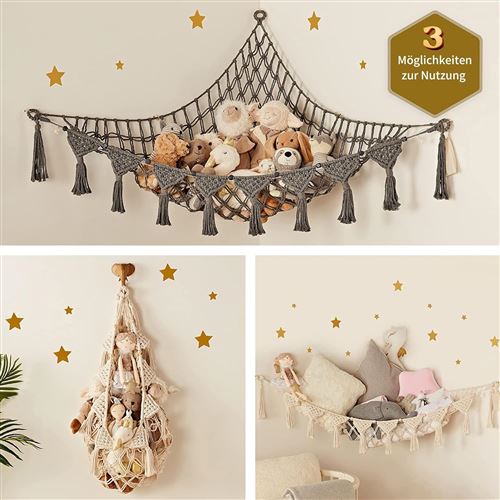Il encourage l'auto-nettoyage chez les enfants grâce à un accès facile et favorise l'adoption de bonnes habitudes d'organisation. Filets-hamacs pour peluches (2025 euble rangeent peluche : le top 10 des eilleurs de ai 2025 - Besteo 【Installation rapide comme rangement suspendu pour jouets】Grâce à ses 3 attaches et crochets pratiques, ce rangement peluche chambre enfant s'accroche facilement, ne nécessite aucun espace ni accessoire supplémentaire et crée instantanément une solution de rangement ordonnée et peu encombrante pour la chambre de n'importe quel enfant. Il permet de ranger facilement des jouets de toutes tailles et de tous types, et durera des années. Hamac en filet pour animal en peluche : 1 paquet de hamac pour animal en peluche, 3 crochets, 10 clips fantaisie (envoyés dans des couleurs aléatoires), un pompon coloré et une guirlande lumineuse de 3 m. Il est facile d'installer le rangement pour jouets dans le coin de la pièce 【Filet de rangement polyvalent pour un usage quotidien】Ce filet de rangement extra-large peut accueillir non seulement des jouets, mais aussi des vêtements, des couvertures ou des oreillers. 【Fabrication artisanale robuste pour une utilisation durable】Ce Filet Rangement Peluche Chambre Enfant est tissé à la main à partir d'une corde en coton de haute qualité, extrêmement résistante aux déchirures et durable. Range Doudou Filet A Doudou Unicorn Castle Hamac En Filet Pour Enfants Avec Lumière LED - Organisateur De Jouets En Peluche à Suspendre - Support D'angle Pour Chambre D'enfant Ou Filet A Peluche Rangement Peluches 45 Jouets