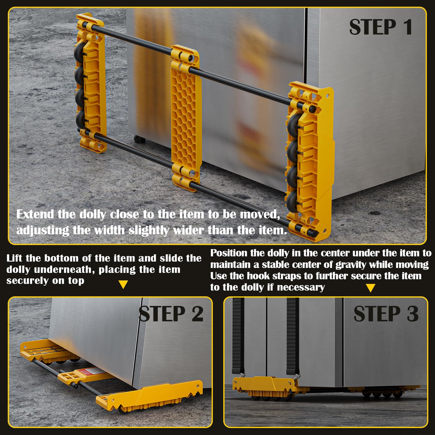 Pour des espaces plus étroits, vous pouvez retirer la partie centrale et placer un panneau sous chaque extrémité de l'objet. Le chariot semble gérer des objets lourds étonnamment bien – est-ce vraiment le cas ? Absolument. Votre objet est maintenant sécurisé et prêt à être déplacé. Tirez la sangle sur votre objet et accrochez l'autre extrémité dans un trou du bloc latéral opposé. En mettant l'accent sur l'ajustabilité, la stabilité et la facilité d'utilisation, nous avons développé un chariot tout-terrain qui s'adapte à votre charge. CONSTRUCTION DURABLE : Fabriqué en plastique ABS haute performance renforcé de fibre de verre et de poutres en acier carbone pour une fiabilité industrielle. Comment le chariot reste-t-il stable sur un sol irrégulier ? Les deux blocs principaux portent le poids avec quatre roues chacun. Idéal pour le transport d'appareils électroménagers volumineux et d'équipements Puis-je déplacer un réfrigérateur à double porte ou une armoire à outils avec ce chariot ? Oui. CONCEPTION TOUT-TERRAIN : Roues spécialement conçues pour s'adapter à diverses surfaces, y compris les seuils, le gravier, le béton, l'asphalte et la terre battue Chariot Tout-terrain 907kg Chariot De Transport Réglable Extensible Jusqu'à 91 Cm Capacité De Chariot Pliable Bricolage Ce chariot de transport professionnel est conçu pour affronter les terrains les plus exigeants. Grâce à sa capacité de charge impressionnante de 900 kg, il est idéal pour déplacer des charges lourdes telles que des meubles, des équipements industriels ou des matériaux de construction CAPACITÉ DE CHARGE : Construction robuste supportant jusqu'à 907 kg, équipée de roulettes lourdes à double rangée (8 roues) pour une meilleure répartition du poids et un déplacement fluide. Pour transporter du bois, des plantes, des outils, ou même vos enfants ou animaux, ce chariot pliable est ultra solide – il supporte jusqu'à 900 lbs Cela crée une tension croisée pour stabiliser votre charge dans les deux directions. Remarque : les sangles fournies (198 cm) ne conviennent pas à tous les objets Répéter pour deuxième sangle DMS® Chariot de transport 2 en 1 - Chariot de transport - Chariot à Centrez la charge sur les blocs latéraux, utilisez des sangles si besoin et demandez de l’aide pour les objets très lourds. Le chariot ONEON répartit le poids sur des roues robustes, permettant à une seule personne de déplacer de gros objets sur un terrain difficile – sans astuces, juste un design intelligent. LARGEUR RÉGLABLE : S'étend de 33 à 91 cm pour s'adapter à différentes tailles d'appareils, de meubles et de matériaux de construction déplacer meubles lourds Vidéo de marchand