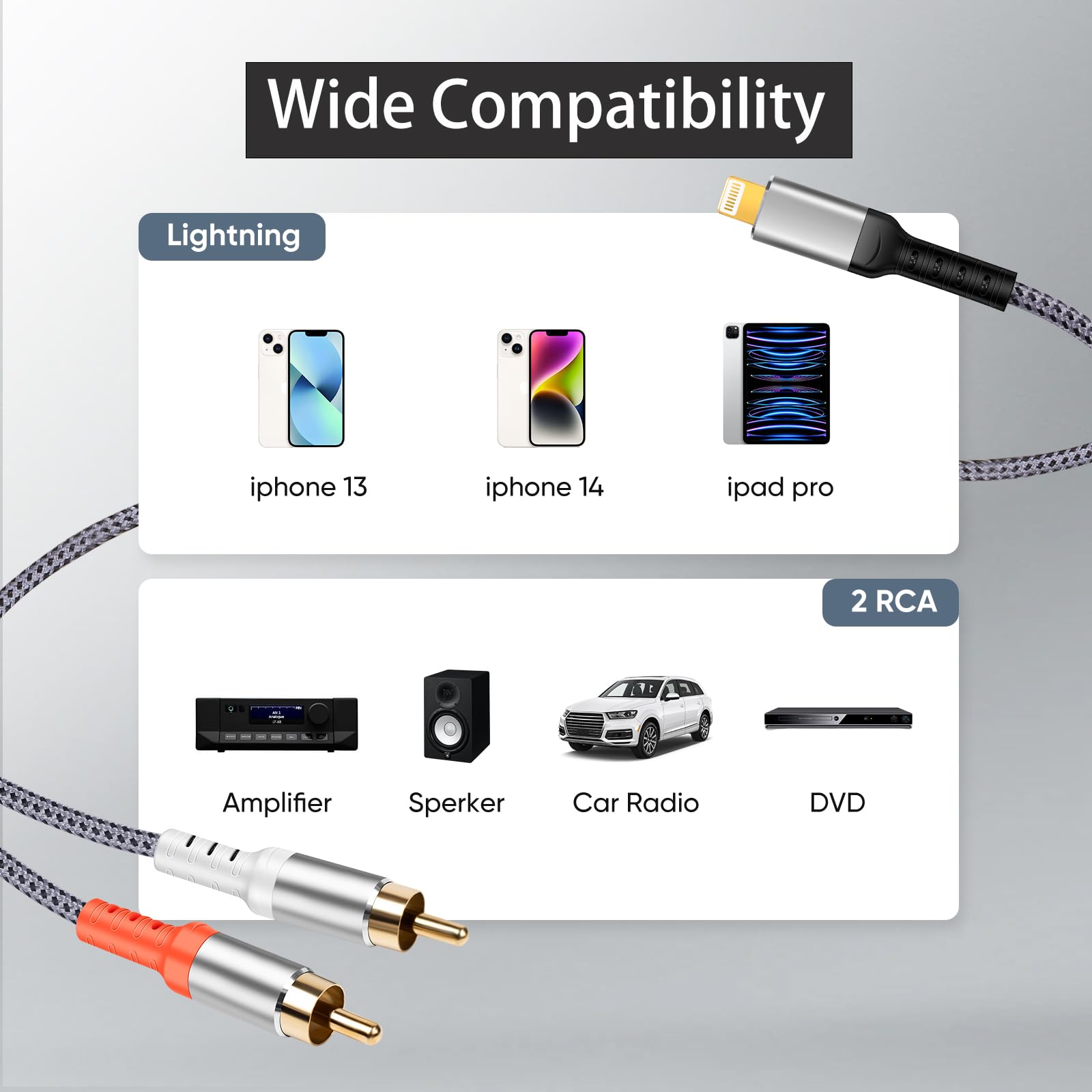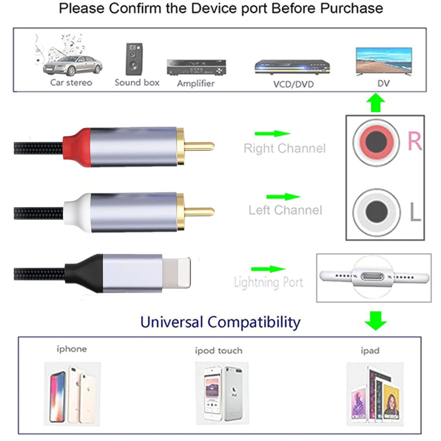 Il suffit de connecter l'adaptateur pour commencer à profiter de la musique. UGREEN Câble RCA Lightning Certification MFI Cordon Lightning Mâle Marque. DONOONIS · Type de connecteur. RCA, RCA Jack · Type de câble. RCA · Appareils compatibles. Amplificateur, Haut-parleur, Radio de voiture, Télévision Utilisations : Connecter votre iPhone à des systèmes audio domestiques, autoradios et autres appareils équipés de prises RCA 2 voies. Vous apprécierez des sons clairs et riches à chaque utilisation. Idéal pour écouter de la musique, regarder des vidéos ou jouer à des jeux avec un son de haute qualité. Usage : Connexion d'appareils iOS aux systèmes audio avec prises RCA 2 voies 【Compatibilité avec de nombreux appareils】Le câble Light vers RCA est compatible avec une large gamme d'appareils équipés de prises RCA 2 voies ou AUX, tels que des téléviseurs intelligents, des platines vinyles, des systèmes audio, des récepteurs AV, des amplificateurs, des tables de mixage, des contrôleurs DJ, et des autoradios. Nom :Adaptateur Audio iPhone vers RCA – Câble RCA 2 Voies pour iOS Contenu de l'Emballage : 1 x Adaptateur Audio iPhone vers RCA (1 mètre) Prise Auxiliaire Iphone Froggen Cu00e2ble Lightning Vers RCA 2 Mu00e2les RCA Stu00e9ru00e9o Audio Auxiliaire, Compatible Avec IPhone Pour Amplificateur De Puissance, Voiture, Home Cinu00e9ma, Haut-parleur Et Plus Encore Cable Rca Iphone Compatible avec une large gamme d'appareils audio, tels que les téléviseurs intelligents, les platines vinyles, les récepteurs AV, les amplificateurs, les tables de mixage, les contrôleurs DJ, et plus encore. Découvrez notre offre Cable RCA iPhone pas cher : large sélection de produits au meilleur prix | Livraison gratuite à partir de 10€* | Entreprise française | Paiement 4x possible 【Solution de connexion iOS vers RCA】Cet adaptateur audio Phone vers RCA vous permet de connecter facilement votre iPhone à des appareils équipés de prises RCA 2 voies, comme des systèmes audio domestiques, des autoradios, et bien d'autres. 【Design pratique】Ce câble RCA Light est conçu de manière simple et légère, facile à transporter. Connecteurs : RCA 2 voies, plaqué or 24 carats Évitez d'exposer l'adaptateur à des températures extrêmes ou à l'humidité pour préserver sa durabilité. Que ce soit à la maison ou dans votre voiture, vous pouvez facilement connecter vos appareils audio à votre iPhone et bénéficier d'une expérience de lecture de musique fluide et sans coupure. 【Plug and Play】Cet cable auxiliaire voiture phone est conçu pour être simple à utiliser : pas besoin d'installer de logiciels ou d'applications. Il est compatible avec les modèles suivants : i-Phone 13/13 Pro/13 Pro Max/13 Mini, i-Phone 12/12 Pro/12 Pro Max/12 Mini, i-Phone 11/11 Pro/11 Pro Max, i-Phone XS Max/XR/X, i-Phone 8/8 Plus/7/7 Plus/6S/6S Plus/6/6 Plus, ainsi que les i-Pad, i-Pad Air, i-Pad Mini, i-Pad 9, et d'autres appareils iOS. Spécifications : Longueur du câble : 1 mètre