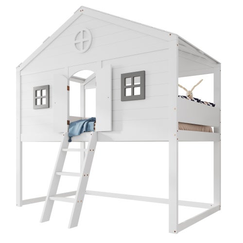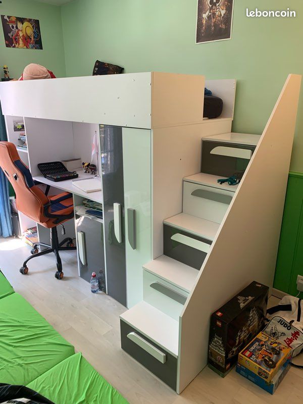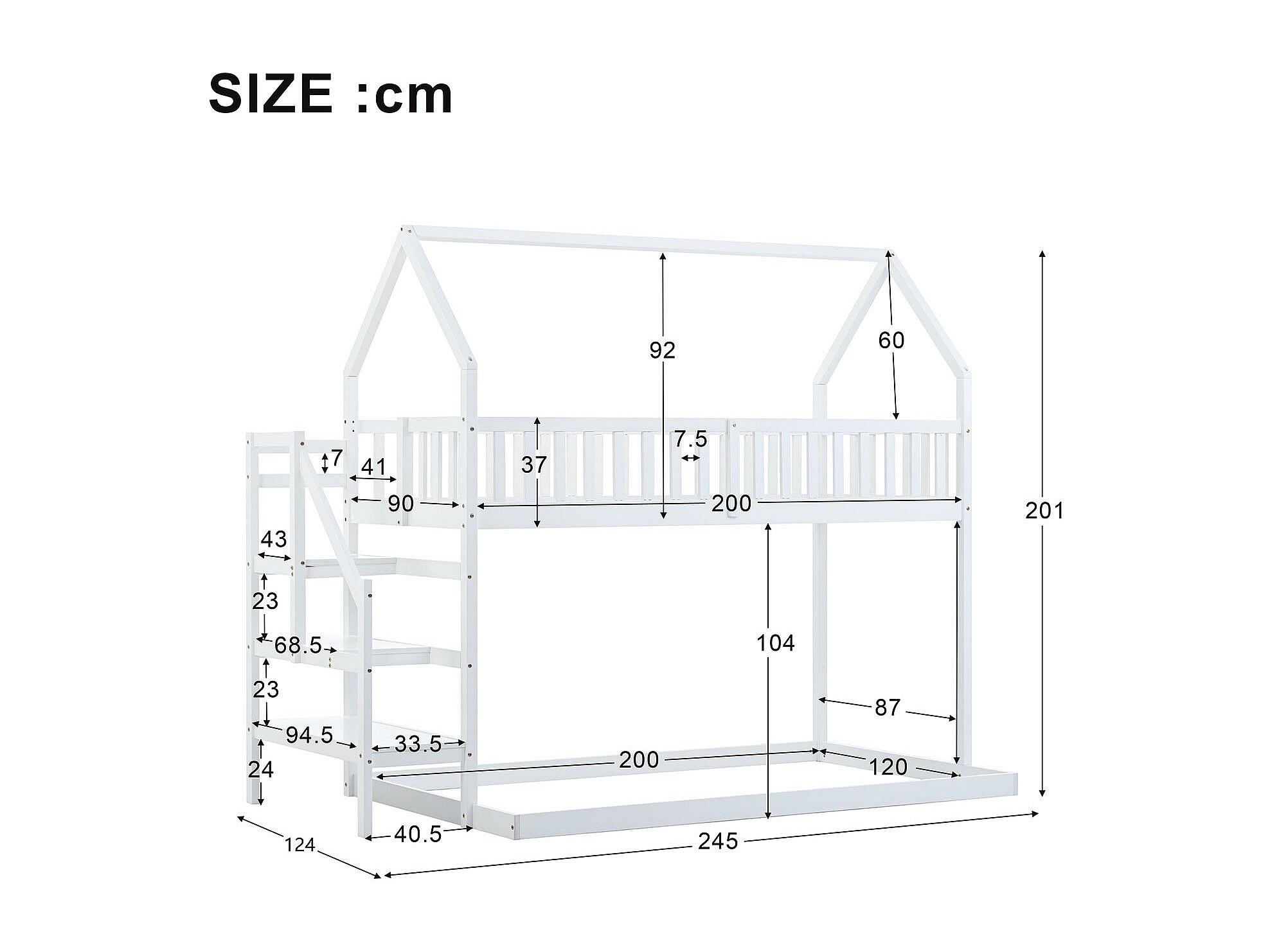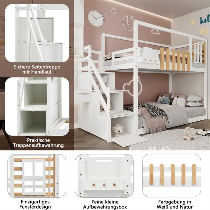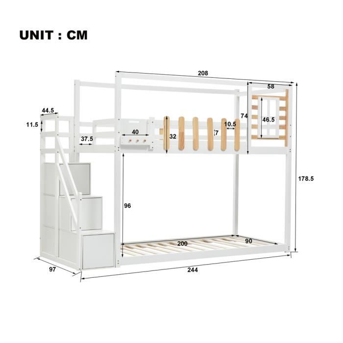 « Lit maison, avec escalier, protection anti-chute et barrière, deux fenêtres grises, lit enfant avec fenêtre, 90 x 200 Pour ce lit, un matelas de 90 x 200 cm est recommandé, avec une épaisseur de 13 cm. Conception pratique du lit superposé avec escalier : ce lit superposé est très peu encombrant et vous pouvez aménager librement l'espace sous le lit. Le lit n'est pas équipé d'un sommier à lattes en dessous Le lit mezzanine dispose de deux jolies fenêtres grises et son design global offre à la fois un espace de rangement, de l'intimité et une bonne circulation de l'air. Le design global offre à la fois un espace de rangement et de l'intimité, ainsi qu'une circulation de l'air pour un confort maximal. Nous vous recommandons de suivre le mode d'emploi afin de garantir la sécurité des enfants lors de l'utilisation du lit mezzanine. Superpose 3 Place Senegal Lit Maison Pour Enfants, Lit Avec Escalier Et Fenêtres, Avec Sommier à Les Lits Superposés Le lit inférieur est livré sans sommier à lattes et l'espace sous le lit peut être utilisé de manière flexible comme espace de rangement, aire de jeux ou couchage supplémentaire, ce qui le rend idéal pour une chambre d'enfant., Points de vente : 1., Matériaux de haute qualité, construction stable 2., Barrière de sécurité sur les quatre côtés 3., Escalier incliné à trois marches pratique 4., Un superbe cadeau 5., Convient à différentes décorations de chambres d'enfants 6., Deux niveaux pour monter et descendre, un plaisir sans limite Poids et dimensions Dimensions totales 204 x 126 x 205 cm Poids total 61,5 kg Distance entre le lit et le sol 74,5 cm Matelas adaptés (matelas non inclus) 90 x 200 cm (épaisseur du matelas ≤ 13 cm) Capacité de charge 120 kg Caractéristiques Nom du produit Lit mezzanine Couleur Blanc + gris Matériau du cadre Pin + MDF + contreplaqué Matériau des lattes Bois Procédure de montage À installer soi-même La structure est-elle interchangeable de gauche à droite ? Non Certificat FSC Oui Nombre de colis 3 Pays d'origine Chine Remarque Ce produit comprend 3 colis. Lit mezzanine certifié EN747 : ce lit mezzanine certifié EN-747 est un produit qui a été rigoureusement testé et évalué pour sa conformité aux normes de sécurité européennes. Ce lit a été soumis à des tests rigoureux afin de garantir la solidité structurelle du lit et la qualité des matériaux utilisés. Il est normal de recevoir 3 colis à des moments différents, merci de votre patience. Lit Mezzanine 90x200 cm Bois Enfant avec Escalier Sécurisé et Le lit n'est pas équipé d'un sommier à lattes en dessous. Structure robuste et durable] Ce lit superposé est conçu avec un cadre en bois massif de pin, assurant une stabilité exceptionnelle et une longue durée de vie. Parfait pour un usage quotidien, il soutient efficacement le poids et garantit la sécurité des utilisateurs.[Rangement pratique et intégré] Les escaliers intégrés sont plus qu’un simple accès au lit, ils offrent...
