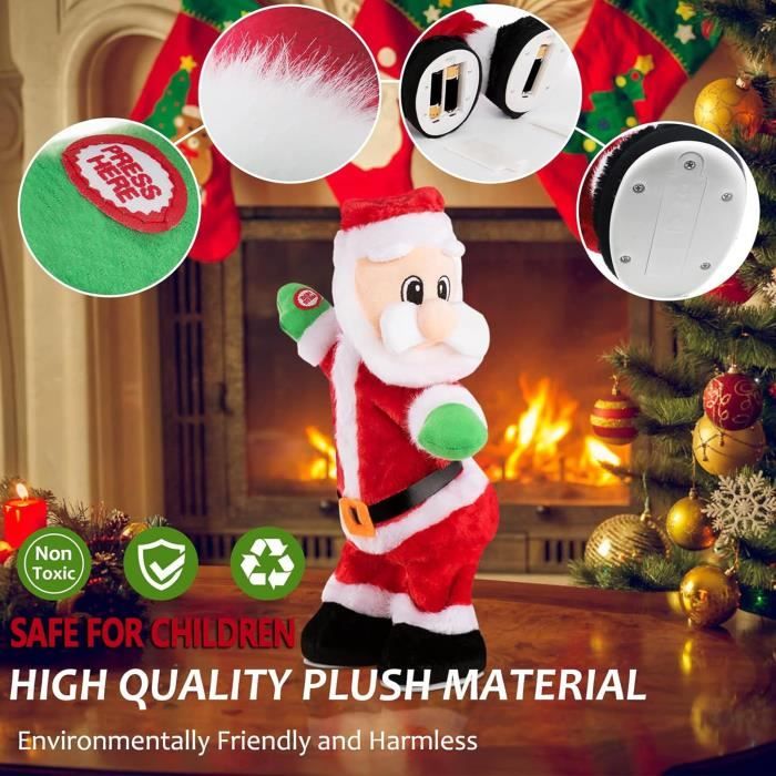 Retirez les piles en cas de non-utilisation prolongée. Construit dans un souci de durabilité et de sécurité, le produit garantit des performances durables et un jeu sûr, rehaussant la joie des fêtes en tant que décoration saisonnière mémorable qui ravit tous les âges avec humour et charme., ., Caractéristiques :., ., -Couleur : Rouge., ., -Matériau : plastique, fer, tissu., ., -Taille : environ 28 cm/11 pouces., ., --Batterie : 3 piles AA (non incluses)., ., Remarque : Mesure manuelle, veuillez permettre de légères erreurs de taille., ., Les couleurs peuvent exister de légères différences en raison des différents écrans., ., Forfait comprenant 1 x Père Noël twerk Avertissement De Sûreté Avertissement : Ce produit contient de petites pièces. Optez pour le Père Noël qui twerke pour ambiancer votre espace de cette figurine automate ! C'est un accessoire qui plaît à tous les membres de la famille. Garantie 2 ans amy.bulle2mam on December 5, 2025: Quand le Père Noël se met au twerk ! #humour #memes #meme #perenoel #noel Facile à utiliser et alimenté par batterie : le jouet fonctionne avec des piles standard (non incluses), garantissant une installation simple et des heures de plaisir dansant sans câblage ni chargement compliqués, parfait pour tous les âges. 3pcs Pere Noel Qui Twerk, Pere Noel Qui Danse avec Musique Conception stable et sûre : fabriqué à partir de matériaux de qualité, ce jouet du Père Noël est conçu pour résister à une utilisation répétée tout en étant sans danger pour les enfants et les adultes, ce qui en fait un ajout à vos traditions de vacances. Charmante décoration de vacances : mesurant 11 pouces de hauteur, ce Père Noël dansant ludique ajoute une décoration unique et accrocheuse à votre maison, bureau ou exposition de vacances, rehaussant l'atmosphère festive avec ses présences joyeuses. Quies Musique Père Noël à Balanoire électrique, Jouet Musical Père Noël à Piles Chantant Et Dansant Père Noël Jouet Noël Musical Amusant Installez des piles appropriées avant utilisation pour éviter les fuites. Combine l'esprit de vacances ludique et le divertissement avec un Père Noël dansant unique qui présente des mouvements de twerk animés et une musique festive, parfait pour ajouter de l'excitation à toute réunion de Noël, fête ou décoration de la maison ;. conçu pour une utilisation facile, ce Père Noël dansant divertissant nécessite des piles (non incluses) pour un fonctionnement pratique et un plaisir festif sans configuration compliquée, ce qui le rend idéal pour une utilisation à la maison, au bureau ou lors de fêtes ;.