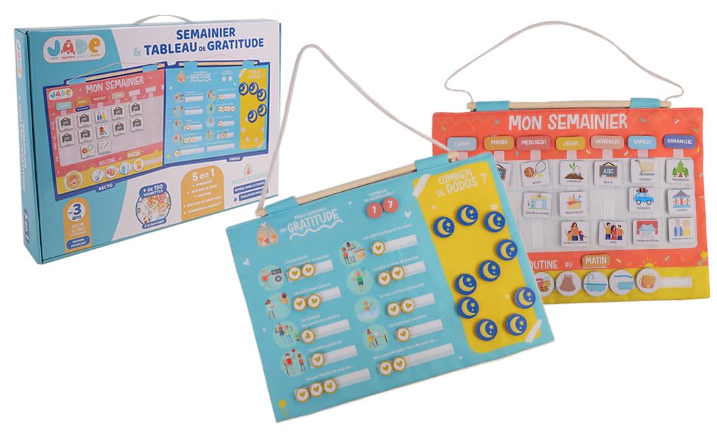 Avertissement De Sûreté ATTENTION !, Petits éléments. Apprends en t’amusant avec notre calendrier enfant : date, météo, émotions et saisons en un seul kit Montessori pour une routine fun et éducative Description du produit J., A., D. Une marque de jouets éducatifs conçus pour éveiller la curiosité des enfants et les accompagner à chaque étape de leur croissance, en stimulant leurs sens et leur développement en douceur 2 FACES POUR GRANDIR : Au recto : apprendre la date, reconnaître la météo et choisir sa tenue pour encourager l’indépendance, au verso : explorer la roue des émotions, ajuster son énergie, lire un mot bienveillant et pratiquer un retour au calme apaisant CONTENU : 1 calendrier recto-verso, + de 100 vignettes à scratcher et 10 cartes outils pensées pour guider enfants et parents. Un coffret riche pour structurer les journées, encourager le dialogue et construire des repères stables dès le plus jeune âge Calendrier perpétuel en bois avec activités - So Montessori Les marques détenues par MGM portent haut les valeurs du groupe : respect, qualité, honnêteté et dynamisme. J.A.D.E - Calendrier Semainier Gratitude Pour Enfant - Montessori Tableau Recompense Enfant J.A.D.E - Calendrier Semainier Gratitude Pour Enfant - Montessori - 141511 - Jeu Educatif - Multicolore - Tissus - Humeur - Dodo - Jeu Pour Enfant - Desgin Français - Jade - À Partir De 3 Ans Calendrier Semainier Montessori ON EST MARDI : Ce calendrier ludique aide les enfants à se repérer dans le temps, exprimer leurs émotions et adopter une routine positive. Ce calendrier ludique aide les enfants à se repérer dans le temps, exprimer leurs émotions et adopter une routine positive. Un coffret riche pour structurer les journées, encourager le dialogue et construire des repères stables dès le plus jeune âge Au recto : apprendre la date, reconnaître la météo et choisir sa tenue pour encourager l’indépendance, au verso : explorer la roue des émotions, ajuster son énergie, lire un mot bienveillant et pratiquer un retour au calme apaisant Imaginé en France, ce calendrier en tissu est aussi beau qu’utile. Offrez-le à un enfant dès 3 ans pour l’aider à grandir avec confiance. Un cadeau original, durable et éducatif qui allie douceur, pédagogie et autonomie au quotidien., ATTENTION !, Petits éléments.