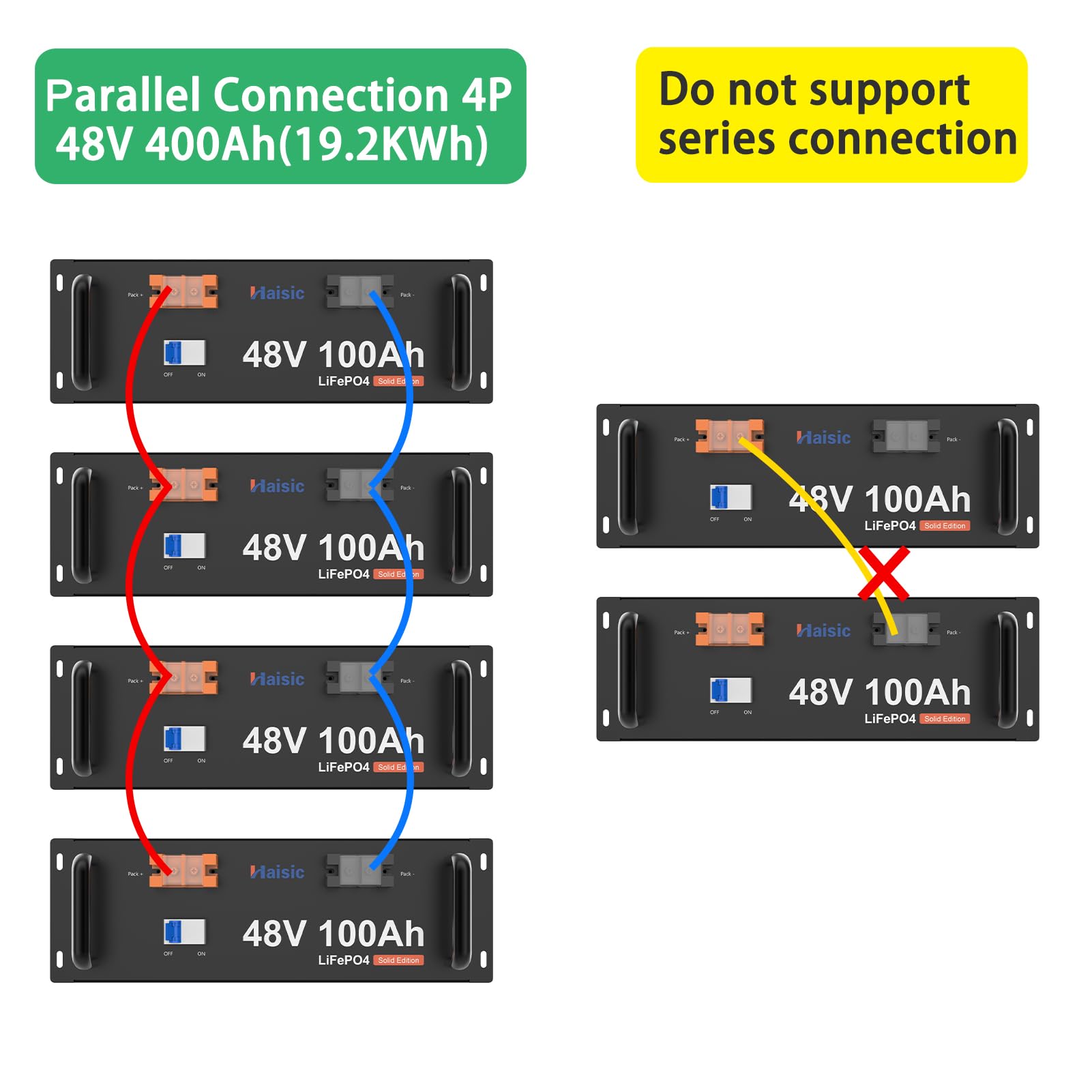 Notre batterie LiFePO4 peut être commutée en parallèle avec jusqu'à 15 batteries (15P) pour construire une batterie de 51,2 V 1500 Ah. Ainsi, vous pouvez facilement l'assembler vous-même [BMS intelligent 100 A] La batterie à cycle profond de 48 V dispose d'un BMS intégré de 100 A pour protéger contre les surcharges, les décharges profondes, les surintensités et les courts-circuits avec un excellent taux d'auto-décharge. La coupure de surchauffe empêche la charge à plus de 75 °C. Conception de montage en rack avec capacité extensible : cette batterie pour rack de serveur 3U est conçue pour maximiser l'efficacité de l'espace et s'adapte aux armoires standard de 19 pouces. 48 V 200 Ah LiFePO4 Battery, 9.6 kWh Wall Mounted Lithium Battery with 100 A BMS, 4000-15000 Construisez votre propre station d'énergie. La batterie au lithium Feence 48 V 100 Ah prend en charge une intégration fluide avec Victron, Luxpower, Sol-Ark, Growatt, Deye et plus encore. Il s'agit d'une batterie de stockage très pratique et intelligente pour votre maison. 【Montage en rack Plug and Play avec kit parallèle】 Avec la conception de montage en rack 3U, les bornes rapides et les câbles parallèles de 4 AWG inclus, vous pouvez rapidement configurer votre système de 10 kWh – sans énigmes de câblage. Communication directe CAN/RS485 : les ports CAN et RS485 intégrés ainsi que les câbles de communication fournis facilitent la connexion parallèle des deux batteries avec onduleurs pris en charge. Nos batteries au lithium pour rack de serveur 48 V 100 Ah fournissent un courant stable et fiable pour votre système hors réseau, votre stockage domestique, votre camping-car ou votre installation solaire, ce qui en fait la solution d'alimentation ultime pour votre maison Deux unités BMS indépendantes assurent plus de sécurité, de fiabilité et de flexibilité dans différents scénarios d'installation. Prend en charge l'évolutivité jusqu'à 15P Batterie Ultimatron LiFePO4 de haute qualité, 48 V et 100 Ah, fabriquée en France pour bateaux et camping-cars. Technologie moderne – jusqu'à 100% de décharge et 6 000 cycles à 80% de décharge Écran LCD et surveillance de l'application : nous avons équipé la batterie d'un écran LCD et d'un voyant de contrôle LED, ce qui vous permet de consulter les données/statut de la batterie, le SOC de la batterie, les alarmes, l'état de fonctionnement et plus encore en temps réel. 【BMS intelligent, cellules de classe A】 La batterie Lifepo4 Feence 48 V est équipée de 16 cellules LiFePO4 de classe A et d'un BMS intelligent intégré de 100 A, offrant plus de 8000 cycles et une grande tolérance de température. Le boîtier en métal assure non seulement une durabilité robuste, mais favorise également la dissipation de la chaleur pour un fonctionnement durable et fiable grâce à sa structure intégrée., 【Puissant, max. L'énergie maximale est de 76,8 kWh et la puissance de charge maximale est de 76,8 kW – pour les grandes installations solaires ou les solutions de sauvegarde UPS puissantes qui évoluent en fonction de vos besoins en électricité. Battery 48V 200Ah Lot De 2 Batteries Au Lithium LiFePO4 48 V 100 Ah 10,24 KWh 48 V Pour Batterie Rack Serveur L'énergie maximale est de 76,8 kWh et la puissance de charge maximale est de 76,8 kW. Écran LCD, application Bluetooth : chaque batterie dispose d'un écran LCD pour les données en temps réel sur la tension, la température et l'intensité, ainsi que la surveillance Bluetooth via une application mobile. Communication CAN/RS485 : la batterie pour rack de serveur LISUATELI 48 V 100 Ah prend en charge CAN/RS485 pour une communication transparente avec les onduleurs solaires tout-en-un courants tels que Victron, GoodWe, SMA, Growatt, SunGrow et DEYE. L'indicateur SOC orienté vers l'avant offre une visibilité intuitive de la charge restante.
