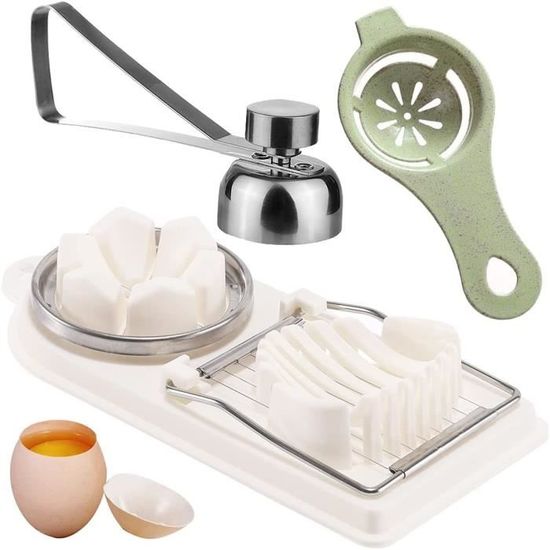 Coupe-œufs : Le coupe-œufs est fabriqué en acier inoxydable 304 de haute qualité et en polypropylène. Perceur D'oeufs en acier inoxydable, Pique Oeuf Perforatrice 1 Trou, Coupe Oeuf À La Coque D'oeuf Séparateur, Outil de cuisine pratique pour les œufs crus et durs avec poignée ergonomique Notre ensemble ouvre-œufs répond parfaitement à vos besoins en cuisine et est un accessoire indispensable. Doté de 10 fils en acier inoxydable bien serrés, le fil de coupe est tranchant et durable, permettant de couper les œufs en 10 tranches d'épaisseur uniforme. Multifonctions : Nos cinq ouvre-œufs répondent parfaitement à vos besoins en cuisine et sont des accessoires indispensables. Le fond est rainuré pour accueillir des œufs de différentes tailles et assurer une bonne stabilité. Caractéristiques : Matériau : acier inoxydable 304 de haute qualité et polypropylène Utilisation : cuisine maison ou traiteur. Guide complet pour découper un œuf : astuces et outils Épeceur à œufs en acier inoxydable : L'épeceur à œufs permet de percer un petit trou dans le bol avant de faire bouillir l'œuf. Avec cet outil, vous pouvez facilement couper les œufs, les coquiller, les empêcher de se fissurer et séparer les jaunes des blancs, pour une dégustation plus fréquente. Contenu : Notre ensemble coupe-œufs contient : 1 coupe-œufs, 1 couvercle en acier inoxydable, 1 perforateur à œufs en acier inoxydable et 2 séparateurs d'œufs. Emelie coupe-œufs 2 en 1 de Dorre Perceur œufs Séparateur Jaune Rose - Ensemble De 4 Moules à œufs Avec Brosse, Ustensile De Cuisine En Perceur œuf Anti-fissure Contenu : 1 coupe-œufs 1 couvre-œufs en acier inoxydable 1 perforateur à œufs en acier inoxydable 2 séparateurs d'œufs
