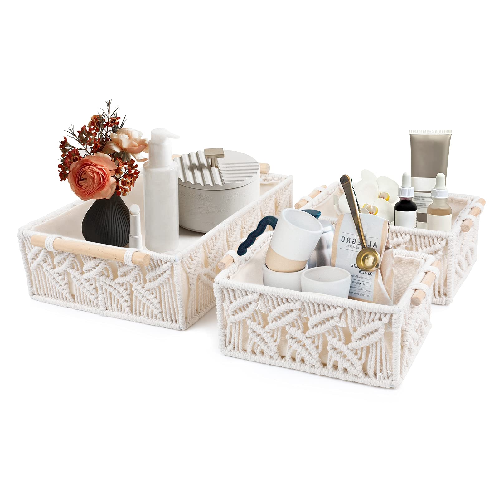 Panier Corde Coton DEDEMCO Paniers De Rangement En Corde Tressée Style Bohème, Panier De Rangement En Corde De Coton Blanc Pour Chambre D'enfant, Jouets, Cadeaux, Cosmétiques, Taille M Panier Basket Toilette Qu'il s'agisse de bougies parfumées, d'huiles essentielles ou d'articles de toilette, ces paniers sont parfaits comme idée cadeau. Paniers macramé : L'accessoire bohème pour une décoration naturelle et tendance Apportez une touche de charme bohème à votre intérieur avec nos paniers en macramé. Faits à la main avec des matériaux de qualité, ces paniers tressés sont à la fois élégants et fonctionnels. Le macramé, une technique artisanale de tressage, ajoute une texture unique et un style authentique à... Le panier osier macramé représente une solution de rangement à la fois unique et originale, qui sort des sentiers battus de l'ameublement traditionnel. Flexible et naturel, ce panier permet de ranger des objets personnels tout en les gardant à portée de main Mettez de l'ordre dans votre chambre et gardez tout à portée de main. Laissez le panier de présentation vide et faites de la surprise de votre cadeau de Noël quelque chose de spécial Panier en bananier déco macramé blanc - Décoration| Containers du Monde Le tissu en coton tissé à la main avec structure métallique est doux mais robuste, de sorte que les paniers conservent leur forme et leur uniformité. Finition exquise : le panier de rangement est tressé à la main, inspiré du style bohème tendance et populaire, Prácticas y bonitas. Coton tissé à la main avec cadre métallique pour maintenir son uniformité et sa forme. Le design de la doublure empêche le matériau en coton de jute de coller à l'objet, plus propre et plus sûr. Poignée robuste pour faciliter le mouvement et la décoration. Panier de rangement avec poignée : chaque panier est équipé d'une poignée en bois robuste qui facilite le déplacement et la décoration des paniers. Les couleurs neutres et le design élégant garantissent qu'il s'intègre parfaitement dans n'importe quelle maison. DIMENSIONS DU PRODUIT : 34 cm L x 16 cm l x 12 cm H et 30 cm L x 14 cm l x 12 cm H.