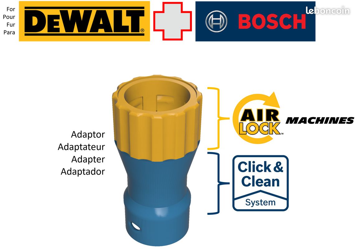 Fixation : les deux côtés s'enclenchent fermement - aussi bien sur le tuyau que sur l'outil - et offrent une connexion sûre. S'adapte à 100 % : un côté compatible avec le tuyau Festool D27, l'autre côté compatible avec les appareils Dewalt compatible avec Air Lock, par exemple pour meuleuse, scie circulaire, scie circulaire manuelle, etc. Il suffit de tourner - Système de verrouillage à clic. DEWALT Kit de raccord AIRLOCK en Y Réf : DWV9470 - Outil Maxi Pro Fabriqué en Allemagne : l'adaptateur d'aspirateur pour le raccord D27 pour AirLock est fabriqué en Allemagne et expédié directement d'ici. 2 pièces Adaptateur tuyau aspirateur pour aspirateurs d’atelier - Adaptateur pour meuleuse, scie sauteuse, scie circulaire, ponceuse orbitale. EN STOCK : Adaptateur aspirateur festool pas cher. Grand choix, promos permanentes et livraison rapide partout en France. Paiement sécurisé Adaptateur Aspirateur Festool Adaptateur De Tuyau FESTOOL CLEANTEC D27 Pour Outil DeWalt AirLock Raccord Ponceuse Scie Circulaire Connectez facilement vos outils DeWalt aux systèmes d'aspiration Festool ! Une solution idéale pour un atelier sans poussière. Compatible avec les outils DeWalt AirLock Adaptateur universel pour tuyau Festool D27 Montage rapide et sécurisé 💡 Pourquoi choisir ce modèle