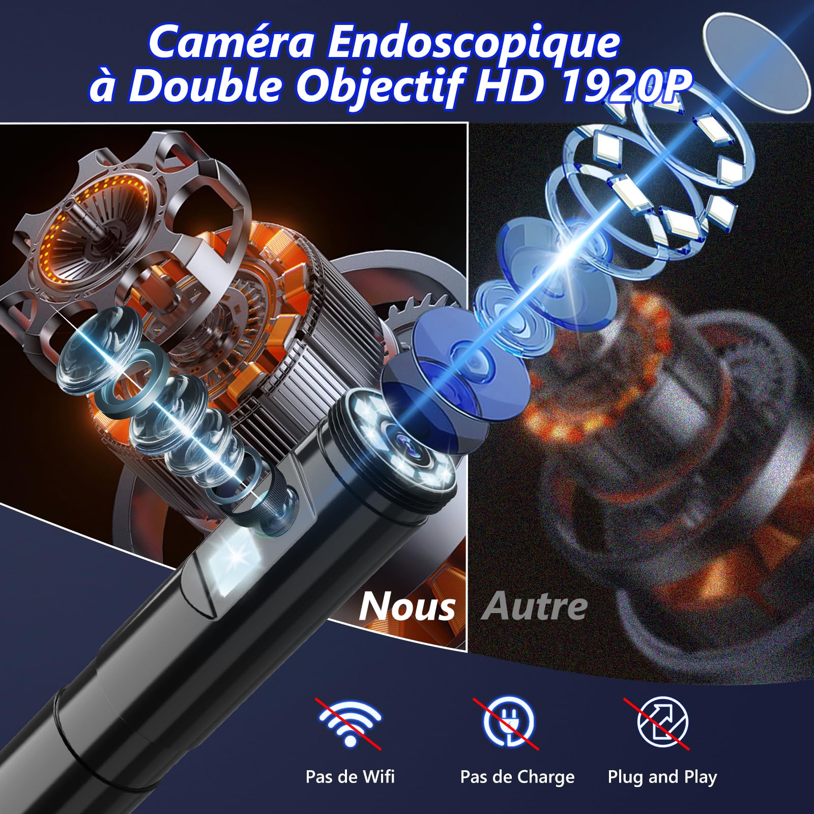 Endoscope à double objectif : La caméra d'inspection endoscopique adopte un design à double objectif et permet de changer d'objectif par simple pression pour un meilleur champ de vision. Sa résolution de 1920 x 1440 vous offre des vidéos et des images HD plus nettes. EN STOCK : Caméra endoscopique double objectif avec éclairage, endoscope HD 1920p avec 8 1 LED réglables, étanche IP67, câble serpent semi-rigide de 5 m, pour iPhone, iPad et Android (type C), E45100030 pas cher. Livraison rapide partout en France Résolution HD 1920p Et Double Objectif : La Caméra Endoscope HD 2.0MP Peut Observer L'image De L'objet à Courte Portée (résolution 1920 X... Elle se déplie et se rétracte rapidement, tout en étant flexible et rigide. YOSOO Caméra d'inspection endoscope Caméra D'inspection Endoscopique Compatibilité universelle : Cet endoscope est compatible avec iOS 9., 0 et versions ultérieures, ainsi qu'avec les appareils Android. Recherchez « USEEPLUS » dans l'App Store ou scannez le QR code pour télécharger l'application et visualiser l'image en temps réel, très pratique à utiliser. Caméra Serpent Pour Mécanique Auto Caméra Endoscopique à Double Objectif Pour Android Et Outil Diagnostic Automobile La caméra de 7,9 mm permet d'atteindre facilement les espaces restreints et offre des effets visuels détaillés pour des inspections précises. UrbanLuxe Caméra d'inspection endoscopique à Double Objectif, câble serpentin Semi-Rigide de 5 m, Double Objectif HD 1920p, avec éclairage 8+1 LED réglables Résolution HD 1920p : Cet endoscope est équipé d'une caméra de 2 mégapixels.