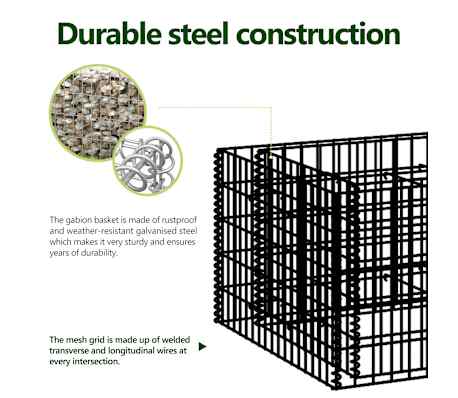 Le gabion robuste est conçu pour être rempli de pierres et de graviers. Lit surélevé à gabion acier 270x90x50 cm Ce lit surélevé en gabion est un moyen pratique de créer une bordure robuste et élégante pour un parterre de fleurs ou de plantes dans votre jardin ou sur votre terrasse Veuillez noter que les pierres et les plantes ne sont pas incluses dans la livraison., Couleur : argenté Capacité de charge : 1 400 kg / m³, Attention ! Veuillez noter que les pierres et les plantes ne sont pas incluses dans la livraison., Attention ! Structure Gabion 270x90x50 ZHG- MODE&CHIC Lit Surélevé à Gabion Acier 360x90x100 Cm ,Moderne Structure Acier Galvanisé Dimensions intérieures : 250 x 70 x 50 cm (L x l x H) Les fils métalliques peuvent être pointus et tranchants ! Portez des chaussures de sécurité et des gants de protection lors de l'installation ! Diamètre du fil : 3,5 mm Lechnical Gabion avec lit surélevé en acier galvanisé 400 x 50 x 100 cm, Gabion, Gabion Jardinière, Gabion Clôture, Gabion Jardin Grande capacité de charge Ce lit surélevé en gabion est un moyen pratique de créer une bordure robuste et élégante pour un parterre de fleurs ou de plantes dans votre jardin ou sur votre terrasse