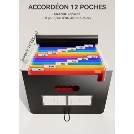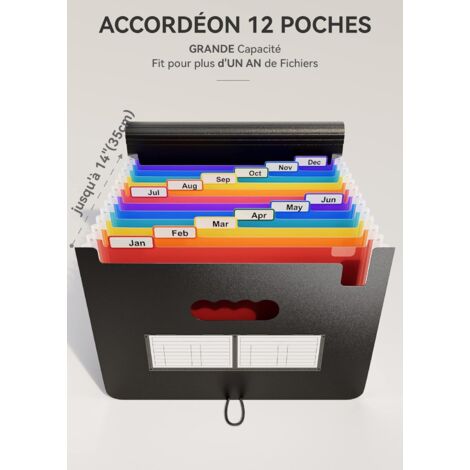 Rangement Papier Trieur à 12 Copartients A4 Trieur Accordéon Extensible Pochettes Pour Organisateur Accordéon La largeur minimale peut être réduite à 2,5 cm, pour un encombrement flexible, ce qui rend le rangement plus pratique. Trieur Extensible En Accordéon, Trieur 26 Compartiments A4 Plastique... Diboniur Trieur 12 Compartiments A4, Rangement Papier Administratif, Extensible Classeur A4 Range Document Bureau, Trieur Document Organiseur de Dossiers Accordéon de Grande Capacité (Noir) 4,6 (711) Plus de 500 achetés au cours du mois dernier 1044 🌾[ Pratique et élégant ] : la nouvelle poignée vous permet de transporter confortablement vos documents, même lorsque le sac est plein. 🌾[ LIGHT LIFE ] : Idéal pour ranger de grandes quantités de documents compliqués ou toutes sortes de recettes, manuels, relevés, factures, coupons, carnets de voyage et même des œuvres d'art et des petits jouets. ThinkTex Trieur A4, 12 Pochettes Extensible Range Document 🌾[ GRANDE CAPACITÉ ] : le rangement papier administratif Agoer s'étend jusqu'à une largeur maximale de 35,5 cm (14 pouces) pour ranger davantage de documents A4 tout en restant immobile. Agoer Trieur A4 12 Compartiments avec Poignée √ Haute Évolutivité : grande capacité, encombrement réduit. √ La largeur minimale peut être rétrécie à 2,5 cm √ Peut être étendu à une largeur maximale de 35,5 cm √ Après avoir placé le fichier, debout stable Plus Sûr et Plus Sain (6 couleurs naturelles * 2) Grande Évolutivité et Gain de Place 🌾[ Système de Rangement Intelligent ] : 12 compartiments intérieurs en 6 couleurs (rose, blanc, jaune, vert, bleu et violet), extensibles ; avec des onglets uniques de couleur mensuelle pour vous aider à classer efficacement et à identifier ce que vous devez trouver d'un coup d'œil. Les multiples combinaisons de couleurs naturelles apportent une touche de fraîcheur et soulagent la fatigue au travail. √ Matériau renouvelable à base de paille de blé : sans BPA, avec un léger parfum de blé.