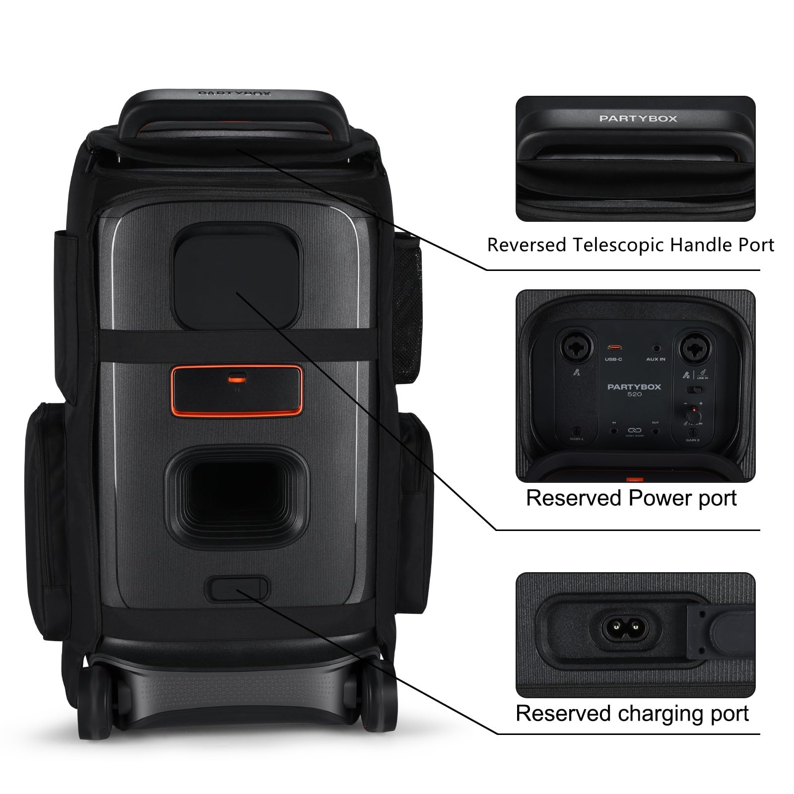 Jbl Enceinte Partybox JBL PartyBox 520 | Enceinte De Soirée Portable Alimentée Par Batterie Jbl Enceintes Portables Il suffit de s’habiller et de faire la fête et de s’amuser avec le Partybox 520 Enceinte. Léger et compact, avec sa dragonne confortable, vous pouvez le transporter facilement ou le glisser dans un sac. Finis les rayures et les chocs pendant le... Matériaux de qualité : la housse de protection pour haut-parleur PartyBox 520 est fabriquée en matériau de haute qualité, avec un tissu en nylon résistant à l'eau et des coutures renforcées pour une protection imperméable, anti-poussière et anti-rayures Focus sur les détails : L’étui de rangement pour housse de protection Étui anti-poussière portable est spécialement conçu pour JBL Partybox 520 Enceinte de fête sans Fil Bluetooth. Le forfait contient : 1x housse de protection noire pour JBL Partybox 520 Enceinte de fête sans Fil Bluetooth (le haut-parleur et les accessoires ne sont pas inclus). JBL PartyCover 520 | Housse de protection pour enceintes JBL Sacs de rangement latéraux supplémentaires pratiques et poches en filet pour emporter des accessoires : étui de protection de voyage avec sacs de rangement latéraux supplémentaires et poches en filet pour emporter un système de microphones sans fil, des parapluies, des bouteilles d’eau, un chargeur, des câbles et d’autres accessoires, habillez l’étui de protection et enroulez votre Partybox 520 Enceinte pour faire la fête avec vos amis. Sac de rangement gauche et droit Sac spécial pour bouteille d’eau parapluie Réservez le port de charge Réserver un port de microphone d’alimentation Le capuchon supérieur zippé rembourré pratique facilite le contrôle de votre Partybox 520 Enceinte, un accès complet à la poignée télescopique, tous les ports et boutons, protégez votre Partybox 520 Enceinte tout le temps. Protection complète pour JBL Partybox 520 Enceinte de fête sans Fil Bluetooth : le manchon de sac de rangement de l’étui de voyage en pe, polyester et velours doux, protège votre Partybox 520 Enceinte de toutes sortes de dommages. Côté gauche Côté droit