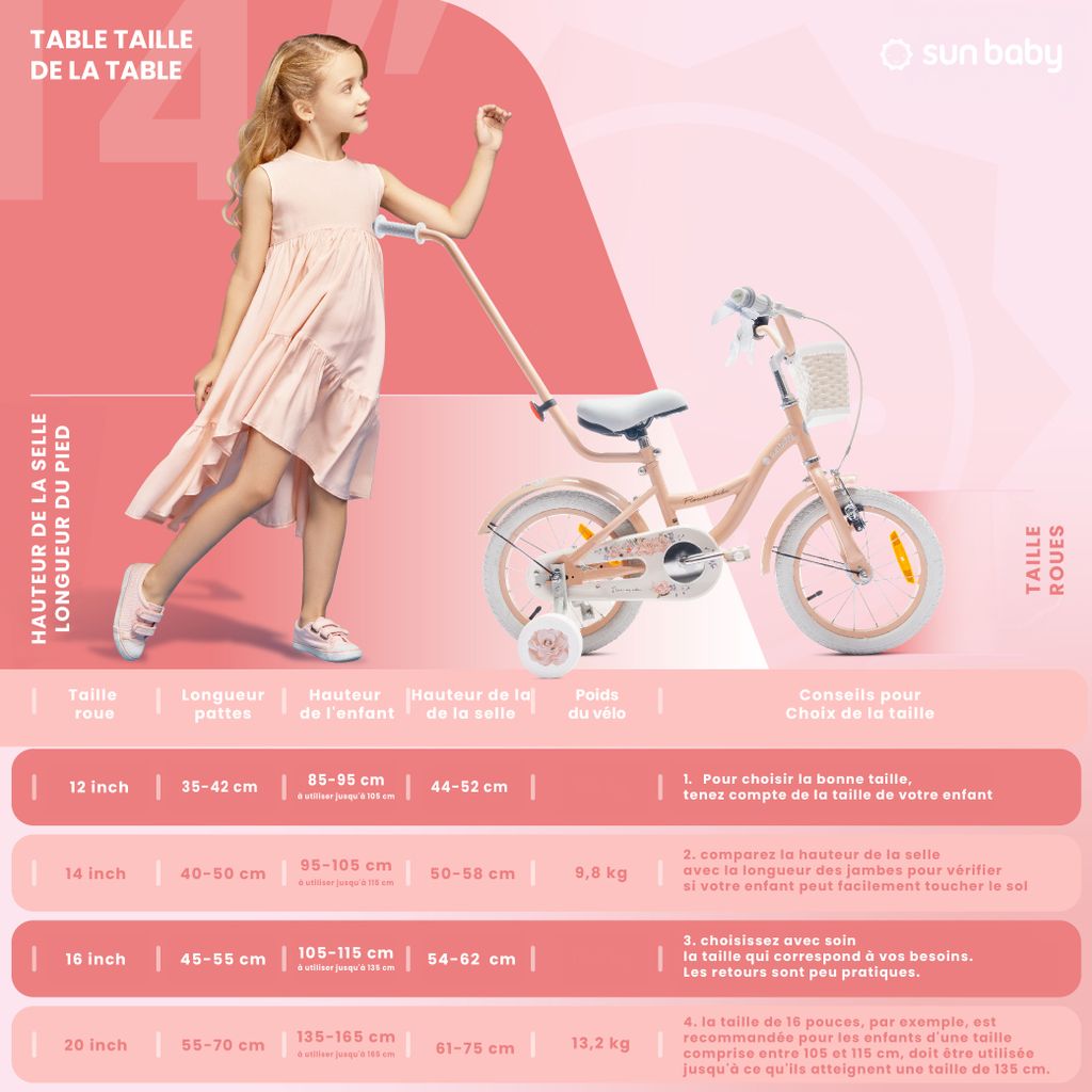 Le vélo est livré pré-assemblé à 85 %. La génération Blanco 14" rose est le choix parfait pour les garçons et les filles de 3 à 5 ans. Ce vélo pour enfant robuste et abordable a un cadre stable et de magnifiques accents marron Le cadre en acier léger est stable et facile à manipuler. Poignées souples et leviers de frein adaptés aux enfants pour une bonne prise en main. Toujours utile quand un enfant commence à faire du vélo. Caractéristiques principales : cadre en acier stable - Couleur rose clair avec des accents marron - Roues stabilisatrices incluses - Frein avant (frein à main) et frein à rétropédalage - Panier en osier sur le guidon - Carter de chaîne fermé - Garde-boue avant et arrière - Pédales antidérapantes avec réflecteurs - Guidon et selle réglables - Hauteur minimale de la selle : 47 cm - Pour les enfants d'environ 3 à 5 ans. Commandez dès maintenant la génération Blanco 14 rose clair et offrez à votre enfant un départ sûr et élégant Cadre en acier robuste, roues de 14 pouces, et surtout une sécurité maximale : frein à rétropédalage frein V-Brake, réflecteurs, et protection de chaîne Les roues stabilisatrices offrent une sécurité supplémentaire lors des premiers essais de conduite. Glerc 20 Pouces vélo Fille âge 7-13 Ans vélo Enfant Style Princesse avec siège poupée Paniere,Blanc avec pneus Beiges - Sport Vélo Fille 5 Ans Vélo Sécurisé Vélo Enfant 3-7 Ans KAPIPALA - Roues Stabilisatrices, Panier Et Siège Arrière Panier Vélo Cadre Acier Léger Frein Avant Rétropédalage Vous montez encore : roue avant, garde-boue, panier, guidon, selle et pédales. Le cadre souple rose clair avec des détails marron sur la selle et les poignées rend le vélo particulièrement beau. Un panier en osier pratique sur le guidon offre de la place pour les peluches ou les petits trésors. Les garde-boue avant et arrière gardent votre enfant propre même par temps humide. La selle et le guidon sont réglables en hauteur et s'adaptent ainsi à la croissance de votre enfant.