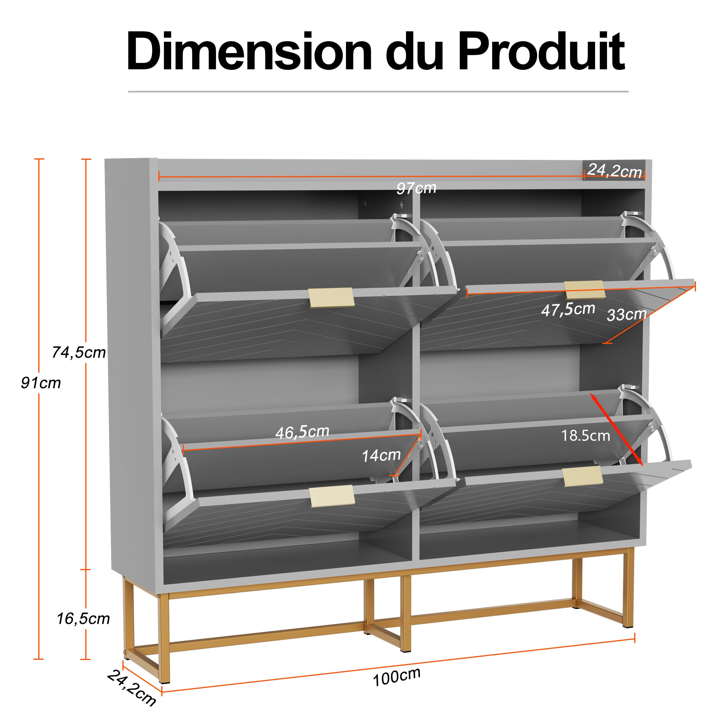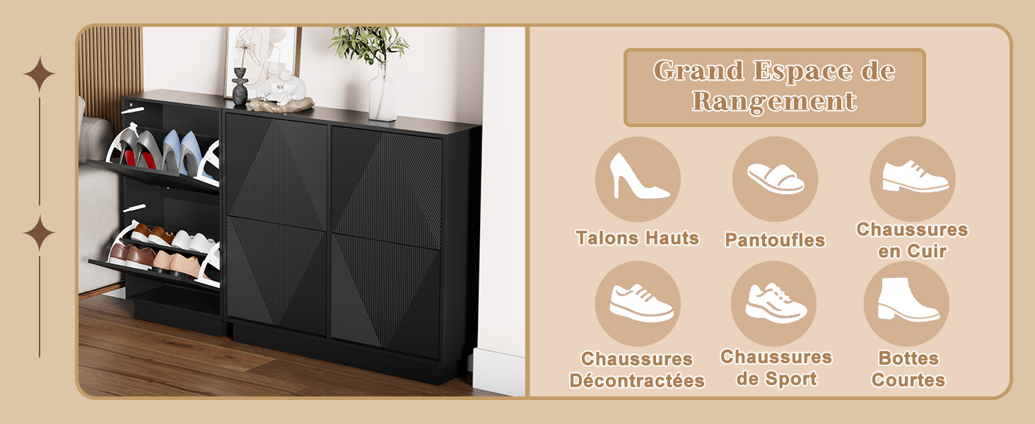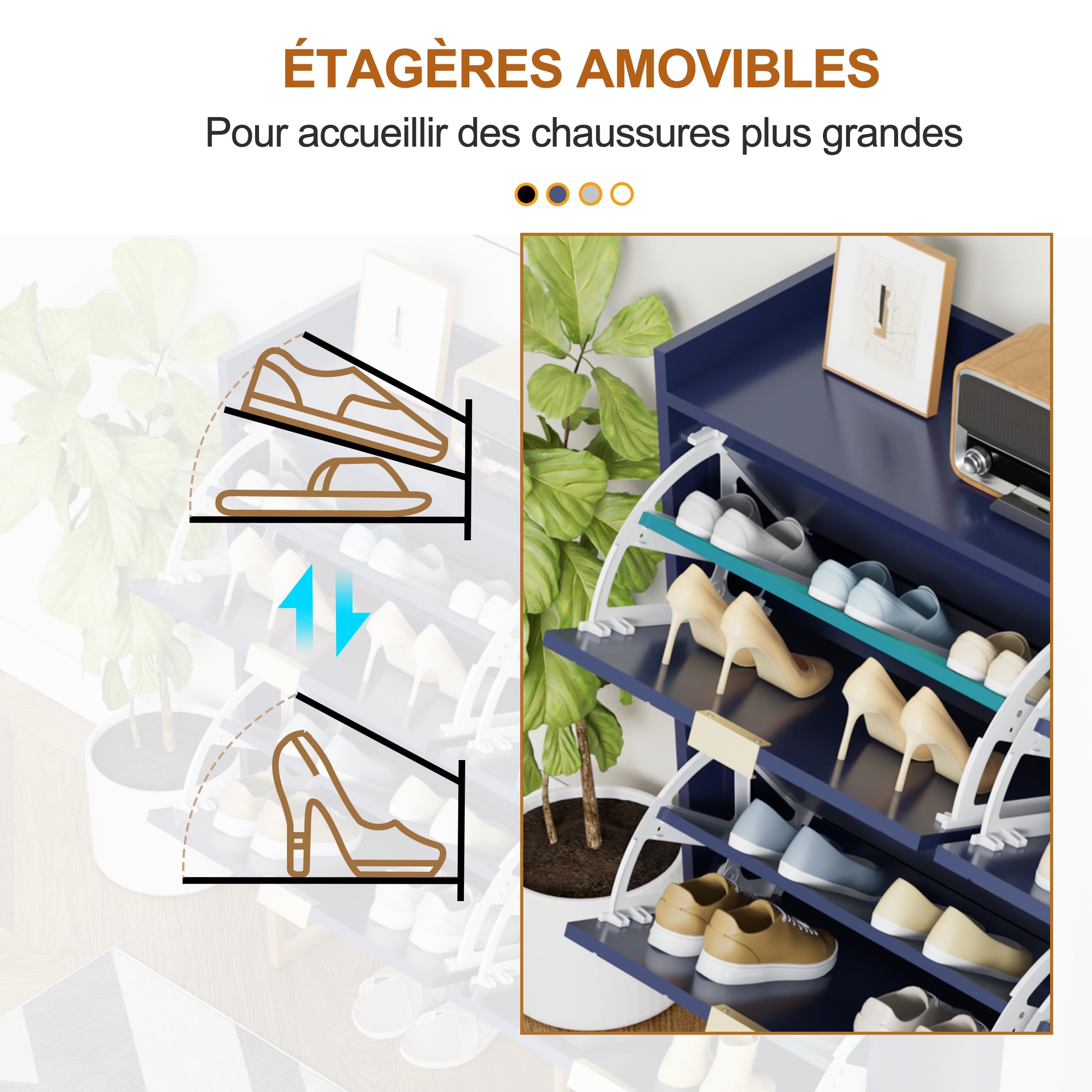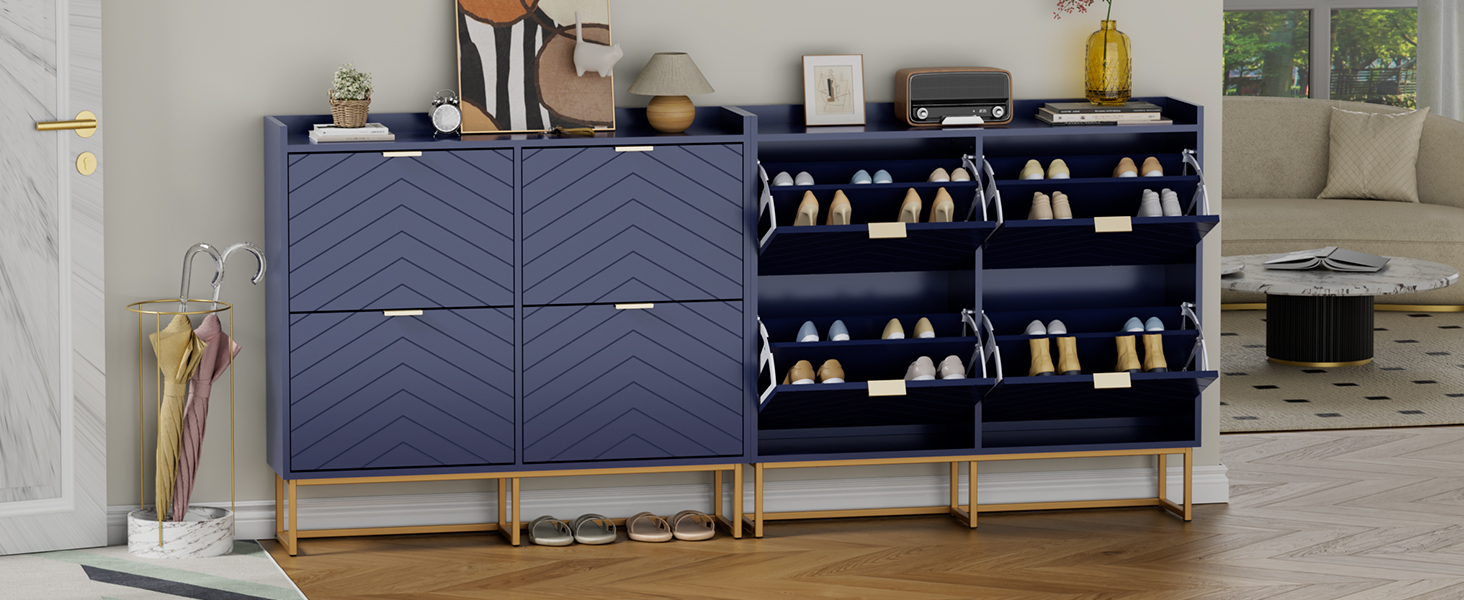 Meuble de Rangement à Chaussures Armoire à Chaussures Commode à Chaussures 4 abattants, FSR79-SCH 【Porte à Ouverture par Poussée】 La porte s'ouvre par simple pression. Meuble à Chaussures UEV Armoire à Chaussures Avec 4 Abattants, Armoire à Chaussures Étroite, Plafond Avec Clôture, Étagère Réglable à 2 Positions, Pour Couloir, Salon, 100x24x91 Cm, Bleu Meuble Entree Couloir Qu'il s'agisse d'un appartement moderne ou d'une maison individuelle simple, sa texture unique apporte une touche d'élégance et de modernité à n'importe quel espace. 【Matériaux de Haute Qualité】Ce meuble à chaussures est fabriqué en MDF robuste et durable, garantissant une stabilité et une durabilité élevées. Il peut être placé de manière flexible dans des zones telles que les entrées et les couloirs pour créer un environnement domestique propre et ordonné. Grand Espace de Rangement]Cette armoire à chaussures dispose de quatre portes rabattables, offrant un espace de rangement suffisant pour les chaussures. L... UEV Armoire à Chaussures avec 4 Abattants, Meuble à Si vos chaussures sont plus hautes, l'étagère du milieu peut être retirée directement. Lorsque vos mains ne sont pas libres, vous pouvez simplement utiliser d’autres parties de votre corps pour appliquer une pression afin de faire sortir la porte. 【Étagères Réglables】 Les étagères peuvent être ajustées en fonction de la taille des différentes chaussures, s'adaptant fonctionnellement aux différents besoins de rangement de chaussures des membres de la famille.
