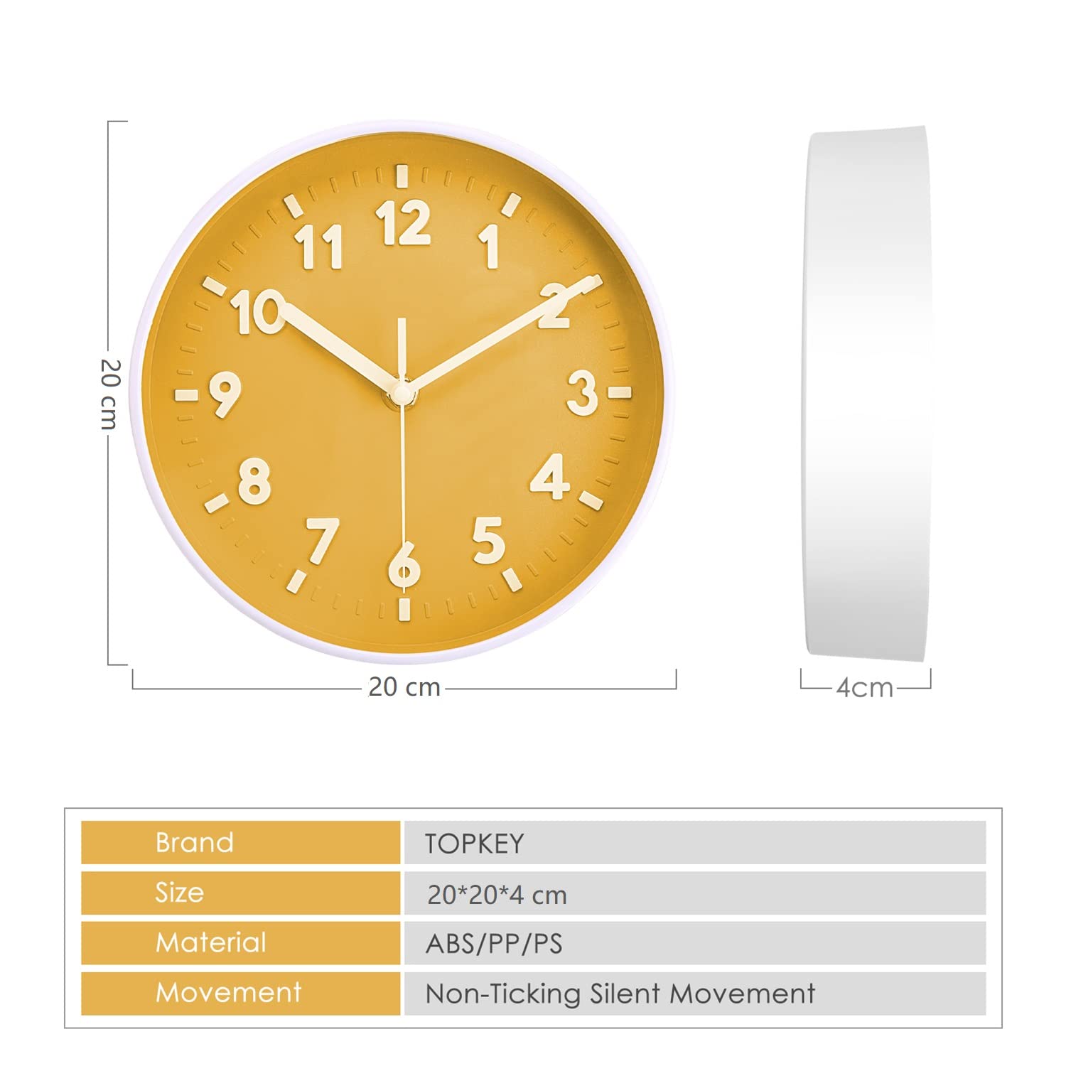 Topkey 8 Pouces Horloge Murale Silencieuse Ronde à Gros Chiffres Horloge Cuisine Chambre Bureau Topkey Horloge Murale Ronde Silencieuse De 20,3 Cm - Facile à Lire - Grands Chiffres - Moderne - Sans Horloge Lisible Design Simple Alimentée par 1 pile AA (non incluse). Spécification du produit 1., Taille : 8 pouces / 20 cm 2., Épaisseur : 1,7 pouce / 4,5 cm 3., Style : Moderne / Classique / Simplicité 4., Aspect : Rond 5., Matériau : Plastique + verre + métal 6., Imperméable à l'eau : Non 7., Type d'alimentation : Une pile AA (non incluse) 8., Type de mouvement : Quartz 9., Application : Salon, bureau, salle de classe, cuisine, chambre à coucher Caractéristiques 1., L'horloge murale à quartz est dotée d'une fonction de balayage silencieux qui garantit l'absence de tic-tac pour confirmer un bon sommeil ou un environnement de travail détendu., 2., Le cadre est solide et robuste, ce qui donne une impression de classicisme à la décoration de la pièce. MOUVEMENT SILENCIEUX - Balayage silencieux et mouvements à quartz précis pour garantir l'exactitude de l'heure, assurer un bon environnement de sommeil et de travail. Topkey 8 Pouces Horloge Murale Silencieuse Ronde à Gros Chiffres, Facile à Lire, pour La Cuisine Horloge Murale DéCorative Moder341 · Présentation du produit Glass cover and plastic frame. Principaux points forts · Marque. Topkey · Couleur. Jaune · Type d'affichage. Numérique · Style. Moderne · Caractéristique spéciale. Le silence, Lecture facile FACILE À UTILISER - La conception de la fente arrière permet une installation facile. Le design simple et élégant est doté d'une finition satinée qui s'adapte à tous les décors., 3., L'horloge est dotée d'une pile AA et peut être remplacée facilement.