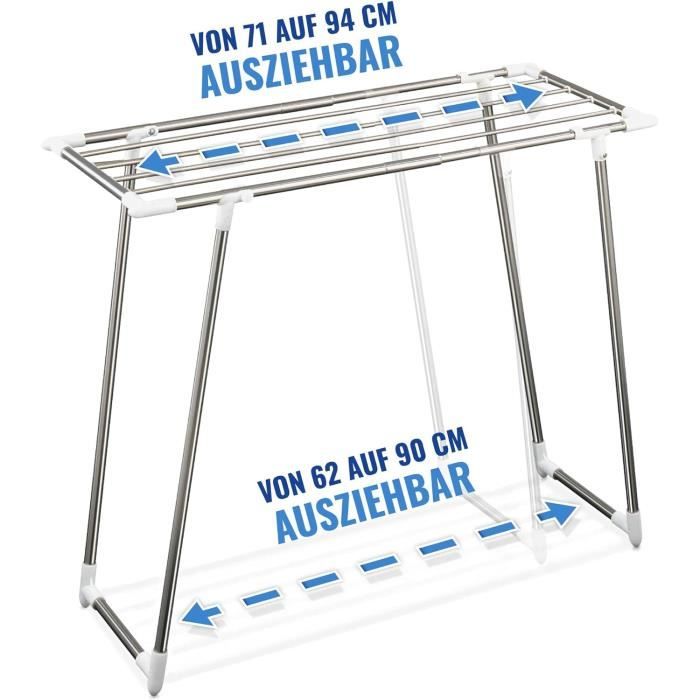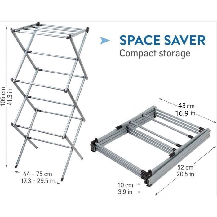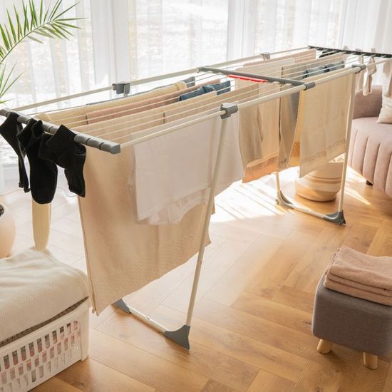 Basics Métal Séchoir à linge pliant - Blanc Pour Vêtement Séchoir Pour Petit Espace InnovaGoods - Séchoir à Linge 3 Hauteurs, Pliable Et Extensible, 11 Barres, Capacité 10-12 Kg, Résistant à L'eau, Fer, Montage Sans Outils, Métallique, Taille Unique Séchoir Pliable Petit Espace Springos offre des solutions pratiques et élégantes pour chaque foyer. Design extensible : le séchoir à linge télescopique offre une surface de séchage de 7,5 m avec 11 barres. Construction robuste : fabriqué en acier revêtu par pulvérisation de haute qualité et en plastique. EN STOCK : Séchoir à linge pliable - étendoir télescopique avec crochets et roulettes pas cher - Retrait & Livraison - Paiement 4X disponible. Accessoires à prix discount Rangement facile : le séchoir à linge est facile à installer et à ranger grâce à sa construction pliable et télescopique. Avec trois plateformes de séchage, chacune équipée de huit tubes, ce séchoir offre suffisamment d'espace pour sécher les vêtements. Sa construction en plastique durable est non seulement fonctionnelle mais aussi facile à nettoyer et s'intègre parfaitement dans tout intérieur Design moderne et fonctionnalité : avec son aspect élégant et sa couleur universelle, ce séchoir s'adapte à tous les intérieurs. Design compact et peu encombrant : après pliage, le séchoir prend peu de place (51,5 x 43 x 9 cm).