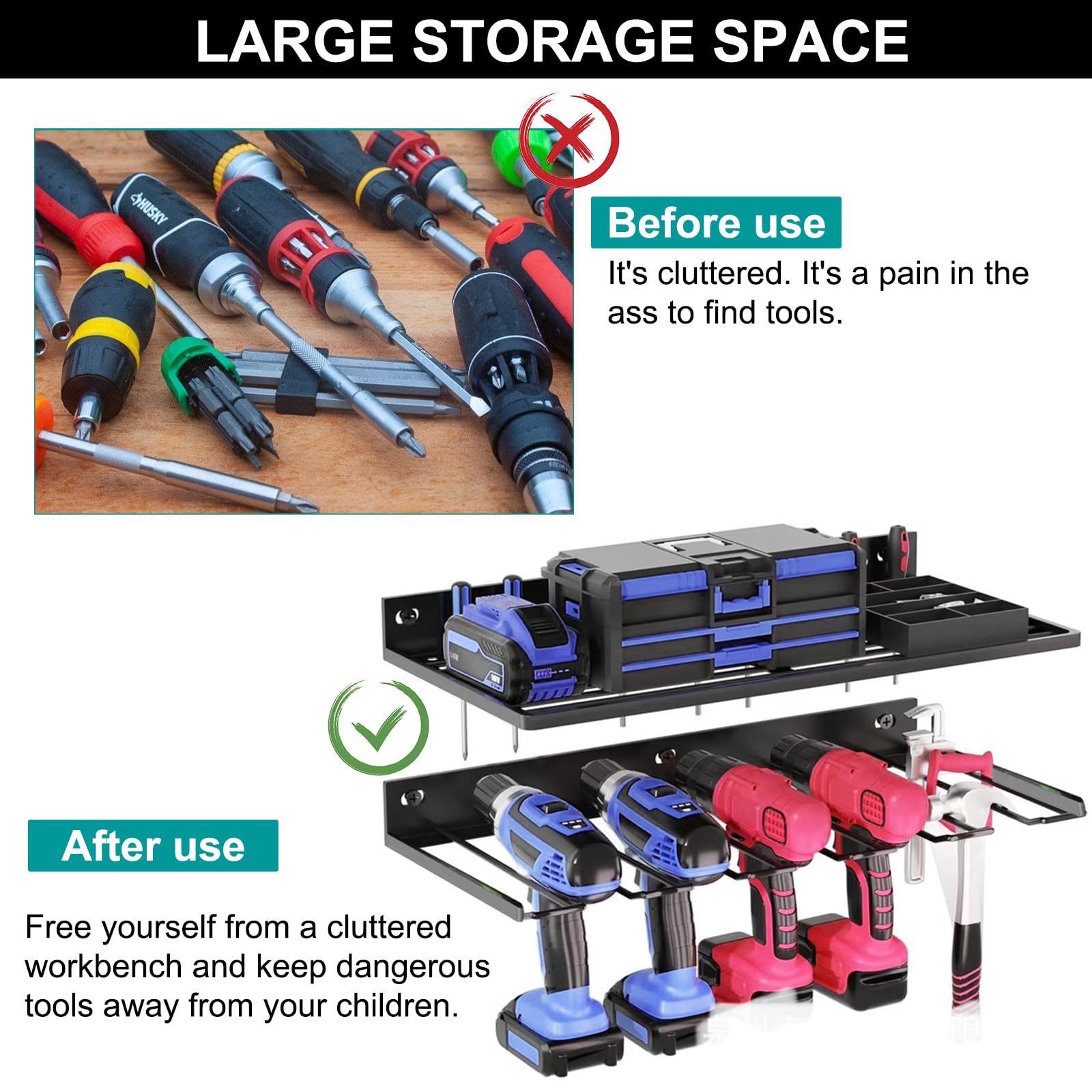vous pouvez assembler selon les instructions Support de rangement mural pour Makita 14.4-18V, 6... – Grandado Organisateur mural pour outils électriques, perceuse à percussion, organisateur avec support tournevis latéral pour garage atelier, 4 niveaux 8 porte-perceuses Économie d'espace: le support mural mesure 45cm de long, 24,5cm de large et 6cm de haut, avec un total de quatre couches, peut utiliser efficacement l'espace du mur, placer les outils en toute sécurité, organiser et ranger les outils à volonté Robuste et durable: nos outils muraux en acier allié industriel avec revêtement épais sont résistants à l'eau, à la rouille et robustes Porte-Outils pour Perceuse à Trois Niveaux de Rangement pour Outils... Application large: les étagères de rangement de garage peuvent être accrochées dans votre garage, atelier, entrepôt, salle d'outils, remise, etc. La structure conçue peut supporter jusqu'à 150 livres YYR Support Mural Pour Outils électriques, Perceuse Sans Fil Et Support De Batterie, Support De Batterie Support De Rangement Pour Outils Electriques Avec Station De Charge Etagere Flottante Pour Organisation De Garage