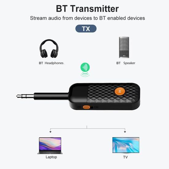 Offre un son haute définition en parfaite synchronisation audiovisuelle pour regarder la télévision et jouer à des jeux vidéo. Émetteur Bluetooth Utilisez-le comme un émetteur Bluetooth pour permettre à votre TV, récepteur AV, radio et autres appareils audio domestiques de diffuser de la musique sur vos écouteurs ou haut-parleurs Bluetooth. Dual-Link Le support fonctionne le mieux avec la même marque/modèle de casque. Giveet Émetteur-récepteur Bluetooth 5.0 pour Regarder la télévision, Adaptateur Audio sans Fil aptX LL/FS 40 ms pour stéréo PC, Radio CD, Flux de Musique, Prise auxiliaire RCA 3,5 mm, Plug n Play En outre, lorsque vous allumez à nouveau le BTI-018, il reconnectera automatiquement les derniers appareils connectés. Appariement de deux appareils : en mode TX, l'émetteur TV Bluetooth Giveet peut être connecté à deux écouteurs ou haut-parleurs Bluetooth, vous permettant de partager la joie des films avec vos amis ou votre famille. Contenu de la livraison : Émetteur récepteur Bluetooth – Câble de charge micro USB BTI-018 câble audio 3,5 mm R/L RCA câble audio manuel de l'utilisateur (français non garanti) Fonctionne comme un émetteur ou un récepteur – pas les deux simultanément. Récepteur Bluetooth Utilisez-le comme récepteur Bluetooth, pour permettre au Bluetooth de recevoir de la musique sans fil depuis votre téléphone portable ou PC. Assure de profiter de votre contenu sans fil préféré tout le temps. Appareil magique comme émetteur Bluetooth : l'émetteur Bluetooth Giveet peut vous aider à transmettre l'audio HiFi sans fil à partir de vos sources audio non Bluetooth, telles que TV, ordinateur, iPod, box TV, MP3/MP4, lecteur CD/DVD, projecteur, divertissement en avion, tapis de course, lecteur ebook, via la prise AUX/RCA, et transmet l'audio à votre casque ou haut-parleur Bluetooth. auvisio Audio-Receiver, Bluetooth: 2er-Set 2in1-Audio-Sender & -Empfänger, Bluet Grande compatibilité : Notre BTI-018 peut fonctionner sur les téléviseurs avec des prises AUX ou RCA de 3,5 mm étiquetées avec « Audio Out ». Adaptateur Bluetooth Audio Friencity Transmetteur Récepteur Bluetooth 5.0 Pour TV Vers Casque, Adaptateur Audio Bluetooth Pour TV/PC/avion/stéréo Domestique/haut-parleur, Prise Jack AUX RCA Numérique Optique 3,5 Mm, Paire De 2 Autoradio Bluetooth Utilisations recommandées : Émetteur : compatible Bluetooth avec votre TV, PC, récepteur AV, Box TV, etc. (Remarque : veuillez vous assurer que votre appareil récepteur doit également prendre en charge ATPX Low Latency., ) et dépend également de l'appareil de réception. Compatible avec les appareils avec sorties audio RCA et auxiliaires. Peut être utilisé comme paire pour étendre la portée, un BTI-018 utilise un émetteur BT, un autre comme récepteur Bluetooth. Connexion sans fil stable : la dernière technologie Bluetooth 5., 3 intégrée, l'émetteur Bluetooth pour TV offre une transmission plus rapide et plus stable, offre une distance de travail allant jusqu'à 10 m, de petite taille et léger, vous pouvez l'emporter partout. (Remarque : nous ne recommandons pas de l'utiliser sur un équipement de musique professionnel., ) Non recommandé pour le streaming de musique en direct (tout en jouant de la guitare, du clavier, des batteries électroniques, etc. Remarque : Si votre téléviseur n'a que le port de sortie optique numérique, vous devez acheter un convertisseur audio numérique à analogique. Un émetteur Bluetooth est un outil qui peut transmettre sans fil de l'audio d'un appareil à un autre. Cela fonctionne essentiellement en ajoutant Bluetooth aux appareils sources qui ne l'ont pas, comme un ancien téléviseur intelligent. C'est là qu'on parle de transmetteur Bluetooth pour TV. Comment en choisir et... L'adaptateur ne prend pas en charge le contrôle du volume et ne peut être ajusté que via un casque Bluetooth/source audio. ) La portée de fonctionnement peut être affectée par les routeurs Wi-Fi, les adaptateurs TV sans fil, les obstacles physiques tels que les murs, les obstacles métalliques, etc. Pas de délai de synchronisation des lèvres Doté de la technologie aptX à faible latence/FastStream, notre BTI-018 est en mesure de réduire le décalage audio Bluetooth à des niveaux indétectables. Profitez d'un délai de moins de 40 ms : l'émetteur auxiliaire Bluetooth Giveet adopte la technologie avancée aptX à faible latence, la latence audio a été réduite de 70 à 220 ms de latence à environ 40 ms.
