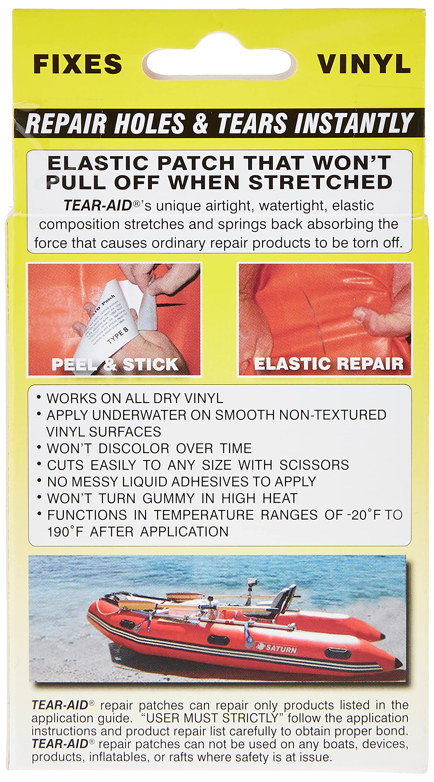 Adhésif Polyuréthane Kit Réparation Tear Aid Tape Type B - Patchs PVC/Vinyle Pour Gonflables, Jouets Piscine | 4 Tailles Tear Aid Kite Bladder Repair Tear Aid Type B Vinyl Repair Tear-Aid Type B : Kit De Réparation Pour Matériaux Et Tissus En Vinyle Kit Réparation Vinyle Trou/déchirure rustine vinyle de type B Chaque patch de réparation TearAid est fabriqué à partir d'une finition mate exceptionnellement robuste, résistante à l'abrasion, en élastomère qui résiste à la perforation et aux déchirures. Cette flexibilité permet au patch de se conformer aux surfaces irrégulières sans restreindre le mouvement du matériau réparé. TEAR-AID® | Repair Kit Type A | Mitre10 Les patchs de réparation en vinyle Tear-Aid contiennent un inhibiteur qui bloque les huiles présentes dans le vinyle résultant en une réparation durable. Ce set Type B convient à tous les tissus en vinyle et PVC. Vous pourrez l'utiliser par exemple pour réparer un matelas gonflable en PVC, un tarp en vinyle … Il est efficace pour des températures comprises entre -30°C et 90°C Chaque kit contient : (1) patch TearAid de 7,6 x 30,5 cm qui se coupe facilement avec des ciseaux à n'importe quelle taille, (1) patch de 2,2 x 2,2 cm, (1) patch de 3,5 x 3,5 cm, (1) filament de renfort de 30,5 cm pour réparer les déchirures sur les bords, (2) l'alcool Coussinets de préparation (1) Instructions illustrées, dimensions du kit : 7,6 x 14 x 3,2 cm Il est combiné avec un adhésif agressif formulé pour une forte adhérence.