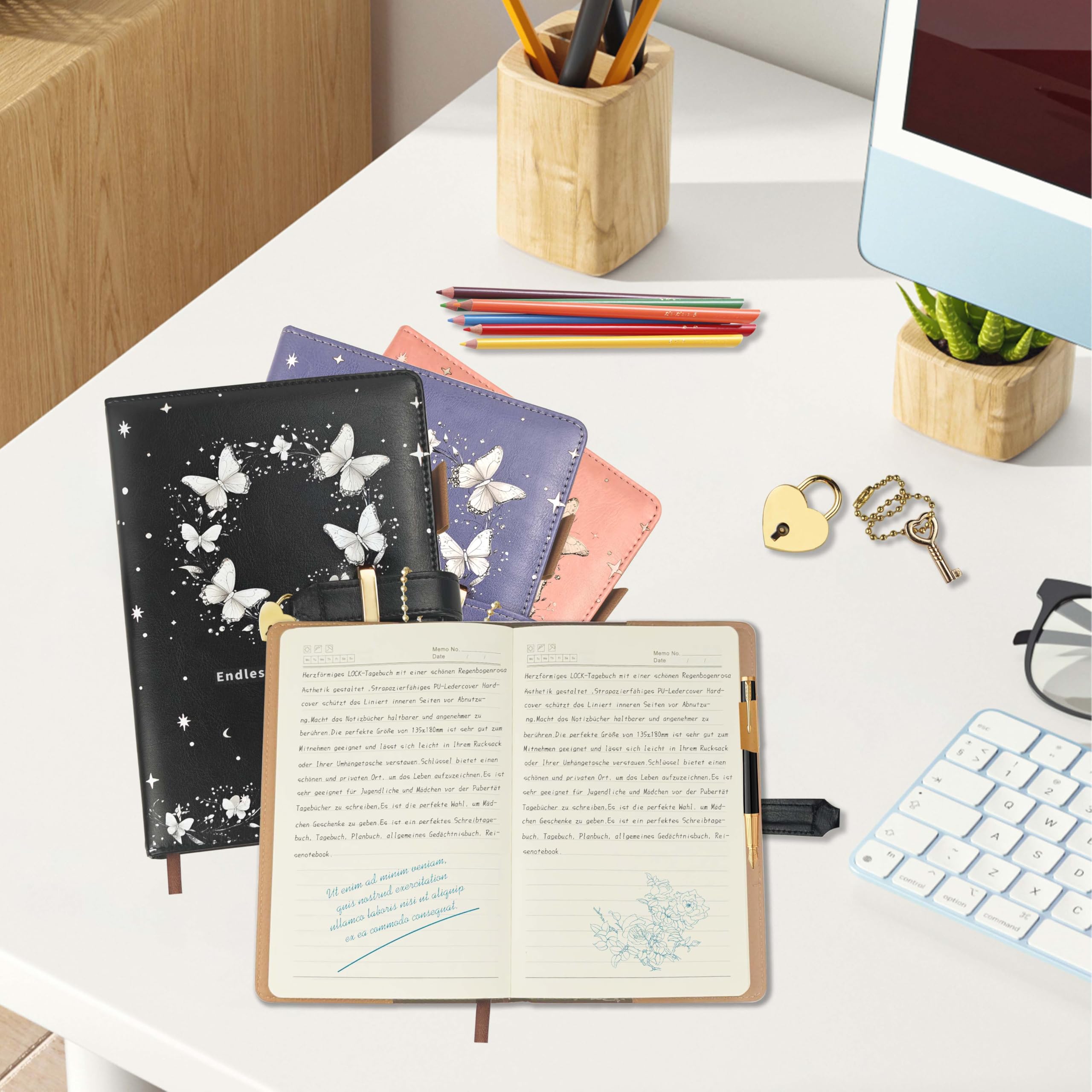 Cadenas d'amour Protection de la vie privée : Les agendas enregistrent généralement les pensées et les secrets les plus intimes d'une personne. Il est également plus facile d'y insérer des photos, des notes et autres éléments. 200 pages offrent beaucoup d'espace pour les souvenirs, les rêves ou les projets créatifs - que ce soit comme journal pour enfants, adolescents ou adultes. Le format A5 (21,8x14,5 cm) se glisse dans n'importe quelle poche et l'élégante devise UV « Endless love for you » donne à la couverture une touche personnelle. Ses vœux de bonheur et de prospérité en font également un cadeau idéal pour les enfants et les amis. Qu'il s'agisse d'un journal inspiré de « Miss Melody » pour les adolescents, d'un « journal à code pour les filles » ou d'un journal classique pour les adultes, ce carnet allie esthétique et praticité Agenda Qefuna avec cadenas, A5 en cuir PU avec estampage à chaud en relief, agenda floral rétro avec combinaison, 200 pages, papier 100 g/m², journal de lecture vintage pour adultes (rouge Le cadenas en forme de cœur protège vos entrées privées, tandis que le design adapté aux enfants ou aux adultes (par exemple, l'inspiration « Top Model Diary with Code ») plaît à tout le monde. Avec 3 options de couleurs et des détails affectueux comme le cadenas en forme de cœur, il devient un compagnon indispensable à chaque étape de la vie. Le revêtement UV offre une surface brillante et résistante aux rayures, et les anneaux métalliques robustes maintiennent solidement le carnet ensemble. Doté d'un porte-stylo intégré et d'un marque-page marron, cet agenda avec cadenas offre une convivialité maximale. Cadeau Journal Porte Stylo Qefuna Journal Pour Ordinateur Portable Pour, Carnet De Notes A5 En Cuir Notebooks Pour Le Travail, 200 Pages Journal De Voyage Pour Femmes Hommes Avec Porte-Stylo Et Ruban, 5.78"×8.34"(Lila Journal Cadenas Cœur Ce journal avec un cadenas en forme de cœur et un délicat motif papillon UV sur la couverture (disponible en rose, violet ou noir) est un compagnon élégant pour les pensées secrètes Ce journal avec un cadenas en forme de cœur et un délicat motif papillon UV sur la couverture (disponible en rose, violet ou noir) est un compagnon élégant pour les pensées secrètes. L'écriture est ainsi plus confortable, car les pages ne se courbent pas vers le haut et ne gênent pas la fluidité du stylo. Le papier de haute qualité 100 g/m² empêche l'encre de traverser, tandis que les pages lignées de 8 mm garantissent une écriture soignée. Son format A5 (21,8 x 14,5 cm) se glisse facilement dans toutes les poches, et l'élégant slogan UV “Endless love for you” ajoute une touche personnelle à la couverture. Le cadenas en forme de cœur empêche les autres d'ouvrir l'agenda à volonté, prévenant ainsi toute atteinte à la vie privée. L'espacement des lignes de 8 mm convient aussi bien à l'écriture manuscrite qu'aux croquis.