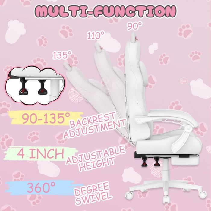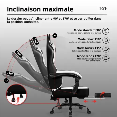 Fauteuil de jeu ergonomique Velocity de 24 po - blanc et rose - Brick Chaise Ergonomique Adolescent Chaise De Bureau Fauteuil Gamer Avec LED RVB - Fauteuil De Jeux Vidéo Rose Et Blanc Similicuir BV659201 - BonneVie Chaise Gaming Design Mignon Outre la hauteur réglable et la fonction pivotante, profitez de la rotation à 360 degrés de cette chaise de gaming inclinable et glissez sans effort dans votre pièce grâce à ses roulettes silencieuses et adaptées au sol. 【Confort ergonomique】Cette chaise de jeu est dotée d'un système avancé de ressorts ensachés intégrés et d'un siège rembourré de 11,5 cm d'épaisseur qui offre un confort optimal et un soutien dynamique pour s'adapter à votre position, minimisant ainsi la pression et réduisant la fatigue pendant les longues sessions de jeu ou de travail. 【Robuste et réglable】Cette chaise d'ordinateur est équipée d'une base métallique renforcée et d'un vérin à gaz, ce qui lui permet de supporter jusqu'à 150 kg. EN STOCK : Chaise gaming avec repose pied pas cher. Grand choix, promos permanentes et livraison rapide partout en France. Paiement sécurisé Grâce à la hauteur du siège et du dossier réglables, la hauteur du siège de cette chaise de jeu peut être réglée de 45 cm à 55 cm, et la fonction de basculement permet de régler le dossier de 90° à 135°. Ce fauteuil gaming s'adapte à toutes vos activités avec trois angles d'inclinaison : 90° pour le travail, 120... Vous avez vu 20 sur 536 articles Convient aux consommateurs de différentes tailles et habitudes d'utilisation. 【Look mignon avec oreilles de chat en plusieurs couleurs】Cette chaise gaming avec oreilles de chat est conçue pour les femmes, les adolescents, les garçons et les filles qui aiment les anime et les jeux mignons.