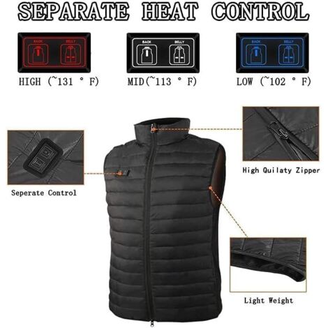 Doudoune chauffante sans manche bleu Profitez de la chaleur et du confort sans vous soucier de l'entretien - c'est aussi simple que cela ! Grâce à l'interrupteur intelligent, vous pouvez sélectionner sans effort le niveau de confort qui vous convient le mieux. Si les zones spécifiques sont utilisées individuellement, le veste chauffante femme avec batterie peut fournir une chaleur continue pendant plus de 10 heures. ==QA:== Combien de temps ce vêtement chauffant peut-il fonctionner une fois que la batterie est complètement chargée ? La durée de vie de la batterie du vêtement chauffant est influencée par divers facteurs, notamment la température, les réglages de chaleur et la capacité de la batterie. La haute efficacité de chauffage de la fibre de carbone assure une distribution plus uniforme de la chaleur par rapport à d'autres éléments chauffants. Gilet Chauffant A Vendre BIAL Veste Chauffante Femme,Gilet Chauffant Femme Avec | FindTheDeal Gilet Thermique Batterie Longue Durée 16000mAh La marque BIAL mène des activités de recherche et de développement sur les vêtements chauffants depuis 2012, accumulant ainsi une grande expérience dans le secteur. De plus, notre fermeture à glissière de haute qualité vous offre le luxe et la commodité d'une poche secrète. Maximiser l'efficacité énergétique De plus, nos vêtements chauffants constituent un cadeau de vacances idéal pour vos proches ou vos amis, répandant chaleur et joie lors des occasions spéciales. Un bon gilet chauffant peut vous tenir au chaud et vous protéger du froid en hiver. Ce vêtement chauffant constitue un excellent choix de cadeau pour les fêtes. Câble de chargement rapide USB-TO-Type C 1 PCS, Sac à linge 1 PCS Que ce soit pour vos sorties en plein air, vos activités de loisirs ou votre vie quotidienne, vous pouvez ajuster facilement les trois niveaux de chaleur (doux, moyen, intense) selon vos envies. Vous pouvez utiliser n'importe quel chargeur de téléphone standard pour le recharger. Notre gilet chauffant offre une chaleur constante, procurant une chaleur enveloppante. Avec protection contre les surintensités et les surtensions, grande capacité et protocole de charge rapide pris en charge. Il est léger, élégant et parfait pour être porté sous des chemises à manches longues, des sweats à capuche ou des pulls pendant l'automne et l'hiver. N'oubliez pas de retirer la pile avant le lavage pour garantir les meilleurs résultats et la longévité de vos vêtements chauffants. De plus, il prend en charge la charge rapide QC 3., 0, ce qui facilite la charge de votre téléphone. Notre veste chauffante pour femmes intègre un système de régulation de température à trois niveaux, stratégiquement positionné au col et à la ceinture pour un contrôle précis et une protection contre la surchauffe. Offrez le cadeau du confort et rendez cet hiver inoubliable pour ceux qui vous sont chers. Assure un contrôle précis de la température Le design du col haut avec éléments chauffants intégrés offre à la fois chaleur et style dans le gilet chauffant. Qui dit « hiver » dit vent glacial et froid de canard. Et pour bien vous préparer à affronter les rudes conditions hivernales, pensez à acheter une veste chauffante. Ce vêtement incontournable de l'hiver existe aussi bien pour les hommes que pour les femmes. Il vous réchauffera tout en... Vous pouvez choisir de les laver à la main ou en machine, ce qui garantit un processus de nettoyage sans problème. 【 Conception spécialement adaptée 】 Spécialement conçu pour le corps féminin, notre veste chauffante femme est adapté à toutes les occasions. 【 Entretien facile et excellent choix de cadeau 】 Résistant au vent et à la pluie, le veste chauffante femme est fabriqué en tissu nylon et rempli de fibres de polyester à 100%. Bénéficier de mesures de sécurité supplémentaires De la sélection de matériaux de première qualité aux coutures impeccables en passant par l'attention portée à chaque courbe et contour, nos vêtements témoignent de notre engagement à vous offrir rien de moins que le meilleur. Le système d'alimentation de ce vêtement peut-il charger un téléphone ? Oui, il peut charger un téléphone et est fourni avec un câble de charge rapide USB vers Type-C. Ces coussins chauffants sont répartis uniformément sur l'abdomen, le dos et la taille du gilet chauffant électrique. 【 Restez exceptionnellement au chaud 】 Restez bien au chaud lors des journées fraîches d'automne et dans les bureaux glacés grâce aux huit plaques chauffantes situées dans les zones clés de votre corps. 【 Chaleur rapide et durable 】 Alimenté par une batterie à grande capacité rechargeable rapidement, le vêtement chauffant se réchauffe en quelques instants. Description du produit Veuillez noter que ce produit n'est pas livré avec un chargeur. Restez au chaud, restez protégé. Support pour le lavage en machine Nos vêtements sont conçus pour être pratiques et faciles à entretenir. La zone du cou est équipée d'éléments chauffants intégrés, garantissant une sensation de chaleur et de bien-être. Découvrez la différence d'un savoir-faire supérieur et rehaussez votre style grâce à nos pièces au design impeccable. Chauffage Nanotubes Carbone Veste Chauffante BIAL Femme - Batterie 16000mAh 7,4V | Pour Ski, Randonnée, Camping Vêtement Chauffant Extérieur Un port de chargement rapide de type C intégré vous permet de charger les smartphones ou autres appareils lorsque vous êtes en déplacement.