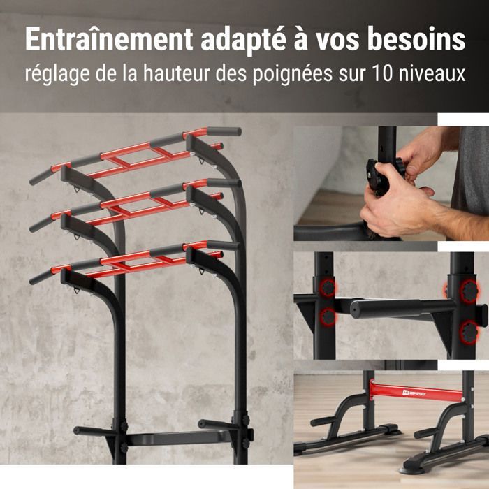 CONSTRUCTION SOLIDE : Cette machine à dips est fabriquée en métal épais, garantissant durabilité et capacité de charge de 226 kg. BARRES DE DIAPORAMA À 80 NIVEAUX DE RÉGLAGE : Notre station de musculation à domicile offre 10 niveaux de réglage en largeur pour une morphologie personnalisée et 8 niveaux de réglage en hauteur pour des entraînements polyvalents. Conçue pour un renforcement complet du haut du corps en homegym, cet appareil de musculation offre une grande polyvalence avec un dossier réglable sur 5 positions (30° à 90°) et un siège ajustable jusqu'à 20 Machine à dips BH L150PB Hi-Power chargée à 90 kg. · Réglage de la hauteur d'assise. · Structure du châssis ultra qualitative en acier de qualité ST-37/40 de 4... Les doubles vis et la base en caoutchouc antidérapant réduisent les vibrations pour un entraînement confortable et stable. HITIK Power Tower avec Banc de Musculation Pliable, Capacité 250 kg, Barre de Traction pour Domicile, Dips Station Chin Up, Ajustable (184-234 cm), Métal POLYVALENT : Avec ses 10 positions de réglage en hauteur, notre support de dips permet une variété d'exercices multifonctionnels. La callisthénie avec barres de traction convient non seulement aux dips, aux dips de poitrine et aux dips à prise étroite, mais également aux entraînements réguliers et aux exercices de musculation du haut du corps. Dh Fitlife Chaise Romaine EXERCICE POUR LE Haut Du Corps, Barre De Torsion à Ressort, Pour Station De Musculation Adaptez-vous à votre morphologie grâce à nos barres de musculation à hauteur et largeur réglables. Nous nous engageons à vous fournir des produits de qualité supérieure qui répondent à tous vos besoins, vous garantissant une expérience d'entraînement pratique et efficace depuis chez vous. Caractéristiques du produit :1., Options d'exercices polyvalentes : Ciblez plusieurs groupes musculaires avec des exercices comme les tractions, les dips et les pompes pour un entraînement complet., 2., Banc amovible : Changez facilement de position pour plus de polyvalence dans votre programme d'entraînement., 3., Construction robuste : Fabriqué en acier de haute qualité avec des poignées en mousse résistantes, il offre stabilité et sécurité pendant les entraînements.