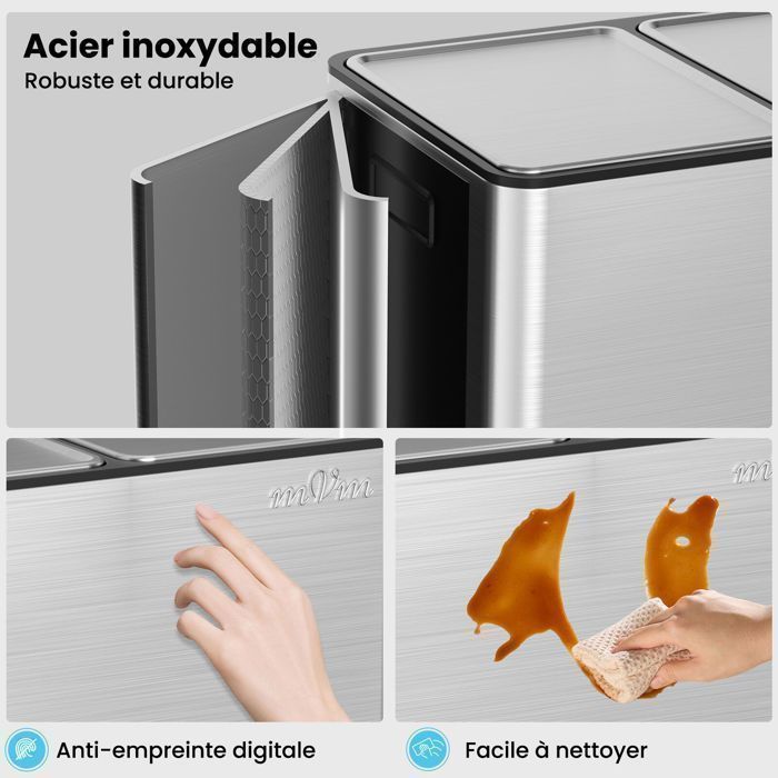 62,5 x 58,5 x 36,5 cm (H x l x P). Base antidérapante Pédale robuste. Notre poubelle s'intègre dans n'importe quel espace, avec une finition anti-traces de doigts. UTILISATION MAINS LIBRES : jetez vos déchets sans désordre ni déversement grâce à la double poubelle VonHaus, dotée de 2 couvercles hermétiques et d'un joint anti-odeurs pour contenir les odeurs indésirables. Kitchen Move - Poubelle de cuisine à pédale tri sélectif grande Couvercles hermétiques anti-odeurs conçus pour garder vos déchets à l'intérieur et les nuisibles à l'extérieur. 1 Base antidérapante 2 Design en inox 3 Utilisation mains libres 4 2 compartiments de 30 L 5 Fermeture douce Poubelle de recyclage double 60 L | 2 compartiments de 30 L Pas le temps de trier vos déchets ? Simplifiez et triez vos déchets au fur et à mesure grâce à la poubelle de recyclage double VonHaus. Chaque bac est doté d'une poubelle amovible avec poignées. Fermeture douce Sans claquement ni fuite d'odeurs. Maison - Découvrez notre offre VonHaus Poubelle de Cuisine à Double Compartiment 60L, Poubelle de Cuisine en Acier Inoxydable, 2x30L bacs amovibles, couvercles101 Videz facilement votre double poubelle ou utilisez les compartiments intérieurs à l'extérieur. ACIER INOXYDABLE ANTI-TRACES DE DOIGTS : cette poubelle de tri sélectif à 2 bacs en acier inoxydable mat robuste et chic sublimera et mettra de l'ordre dans votre cuisine familiale animée. Poubelle encastrable 2 bacs 2x30L Euro Cargo S - Hailo France Ses deux grands bacs de 30 L offrent un espace généreux pour les bouteilles en plastique, les canettes en métal et les déchets courants. Mettez en place un système de recyclage ordonné et triez vos déchets d'emblée grâce aux pédales. Utilisation mains libres Tri des déchets simple et hygiénique. POUBELLES INTÉRIEURES AMOVIBLES : organisez vos déchets en un clin d'œil, du vidage des déchets dans la poubelle à 2 bacs jusqu'à leur vidage complet. SONGMICS Poubelle De Cuisine à Double Compartiment, Poubelle De Cuisine A Double Compartiment Poubelle De Recyclage A Pedale De 60 L Couvercle Restant Ouvert Et Fermeture Souple En Acier Inoxydable 15 Sacs Inclus Argente Ultb202e01 Une fois pleins, utilisez les poignées intégréespour vider facilement les bacs intérieurs amovibles. NOTRE PROMESSE : fondée en 2003, VonHaus vous aide à créer la maison de vos rêves, à l'intérieur comme à l'extérieur. Simplifiez votre tri dès aujourd'hui. Profitez d’une maison et d’un jardin à votre image grâce à notre poubelle de tri sélectif., *