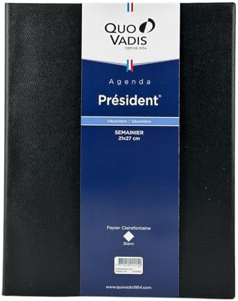 Du design des produits, en passant par la couture des couvertures d’agendas, jusqu’à la distribution, les équipes maîtrisent toutes les étapes de fabrication et donnent vie à des produits d’une qualité reconnue. Agenda semainier 21x27cm spiralé Quo Vadis Président S Impala avec Quo Vadis - Agenda - Spiralé - 2026 - Président S - Semainier Planning - Français - Impala - 14 mois de décembre à janvier - 21x27 cm - par 10avec répertoire Créatrice de moments uniques et de souvenirs depuis plus de 60 ans, Quo Vadis s’adresse à tous ceux qui ont soif d’émotions, d’authenticité, de déconnexion, tout en se montrant respectueux de notre planète. Quo Vadis est la marque qui accompagne le quotidien, les pensées et les projets des petits et grands avec ses agendas et carnets. Agenda hebdomadaire avec présentation de la semaine sur 2 pages afin d'offrir une vue d'un seul coup d'œil, Comprend sur chaque double page une zone libre pour y noter ses rappels (personnes à contacter, choses à faire…), Papier blanc Clairefontaine pour une écriture douce et fluide et coins perforés détachables pour se répérer... Marque française, installée près de Nantes, Quo Vadis s’anime dans plus de 60 pays à travers plus de 10 000 points de vente. Elle comblera les consommateurs en quête d'agendas fonctionnels et sobres grâce à son grain esprit maroquinerie et ses couleurs franches. Agenda Semainier Spirale Président S Quo Vadis - Agenda - Spiralé - 2026 - Affaires S - Semainier Agenda Français 2026 Papier Blanc