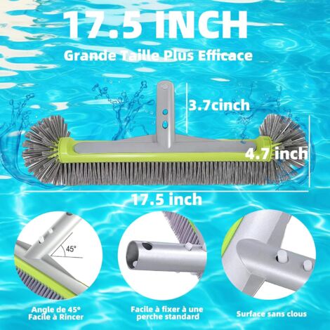 Avec une largeur de 44,5 cm, elle permet un nettoyage efficace de grandes surfaces en peu de temps. Brosse Piscine 45° pour Nettoyage Mural et Carrelage, Brosse Piscine Liner 44cm avec Poils Nylon Haute Densité, Tête de Brosse Compatible avec Manche Standard 1-1/4", pour Piscine, Spa, Sols La poignée robuste en aluminium assure une manipulation facile tout en assurant une longue durée de vie. Poignée durable coudée à 45° pour un nettoyage optimal : la poignée en aluminium renforcée de la brosse de nettoyage pour piscine est conçue à un angle de 45° pour un positionnement idéal, brosse de nettoyage pour le nettoyage de la piscine, tandis que le cadre en aluminium inoxydable et la brosse de nettoyage de la piscine les poils en nylon résistants garantissent une longue durée de vie Utilisation polyvalente : il suffit de fixer la tête de la brosse de piscine à la tige d'extension et elle est prête à l'emploi ! Nettoyage Parois Fond Piscine Balais Piscine Brosse Piscine Extra Large 44 Cm - Nettoyage Parois Et Sol - Poils Nylon - Aluminium - Compatible Télescopique Brosse Nettoyage Piscine 44cm Nettoyage Piscine Mur Et Carrelage Un accessoire indispensable pour l'entretien régulier de la piscine qui vous aide à garder votre piscine propre et accueillante à tout moment. Polyvalent : compatible avec la plupart des tiges de piscine standard de 1-1/4, il suffit de le fixer à une tige télescopique ou d'extension et de nettoyer immédiatement. Pour nettoyer les murs et les carreaux dans les piscines, les appartements et les hôtels, ainsi que pour frotter les sols de la salle de bain et enlever les feuilles des toits. Nettoyage rapide de la piscine : brosse professionnelle robuste pour mur et carrelage de piscine avec poils à bille d'angle mis à jour des deux côtés peut aider à nettoyer le coin et la conception des poils incurvés inférieurs peut nettoyer plus de taches, plus facile pour nettoyer la piscine en moins de temps Brosse de piscine 25,4cm sans manche Summer Waves Matériaux de qualité supérieure : les bords d'extrémité hémisphériques et les poils en nylon haute densité sont conçus pour atteindre les coins les plus durs, et le support en métal offre suffisamment de résistance pour nettoyer en profondeur les murs de la piscine et les carreaux. La tête de brosse est conçue avec un angle de 45°, ce qui offre une meilleure flexibilité, permet de nettoyer les zones difficiles d'accès et réduit l'effort physique.[Protection du Revêtement de Piscine en Douceur]La balai piscine brosse possède des bords lisses et arrondis, ainsi que des poils en nylon de haute qualité pour...