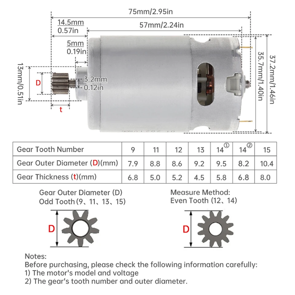 Épaisseur de l'engrenage : 6,8 mm. Diamètre de la tige : 3,17 mm. EN STOCK : Moteur RS-550 - DC 12-24V 21000Rpm Micro Moteur à Boîte de Vitesses Micro Power Tool Micro Moteur à Courant Continu pour Diverses Perceuses sans Fil, MM-FR6414 pas cher. Livraison rapide partout en France YOSOO Moteur électrique RS‑550 Micro‑Moteur CC 12V 22000 tr/min pour... Performance durable et stable : le moteur 550 CC adopte un rotor enroulé en cuivre pur avec double roulement à billes, ce qui réduit efficacement l'augmentation de la température de fonctionnement et la perte de friction, et améliore considérablement la durée de vie. Moteur Dc 12V 550 Moteur Dc Rsu2011550 Micro Moteur Dc 12V 22000 Installation facile, forte compatibilité : le moteur de perceuse électrique RS550 a une structure compacte et un câblage simple, permettant une installation et un entretien rapides. Large application : les moteurs RS550 sont largement utilisés dans les perceuses sans fil, les perceuses d'établi, les perceuses électriques, les tournevis électriques, etc. Moteur 18v Pour Perceuse CHANCS RS550 Moteur DC 16,8 V 9 Dents Micro Moteur De Rechange Pour Moteur Pour Perceuse Sans Fil Bricolage Nombre de dents : 9 dents. * Le moteur RS-550 DC est fabriqué en bobine de cuivre pur, faible courant, haute efficacité et forte puissance de sortie. * La performance de dissipation de la chaleur de ce moteur CC est excellente, avec un bon refroidissement du ventilateur et une performance stable.