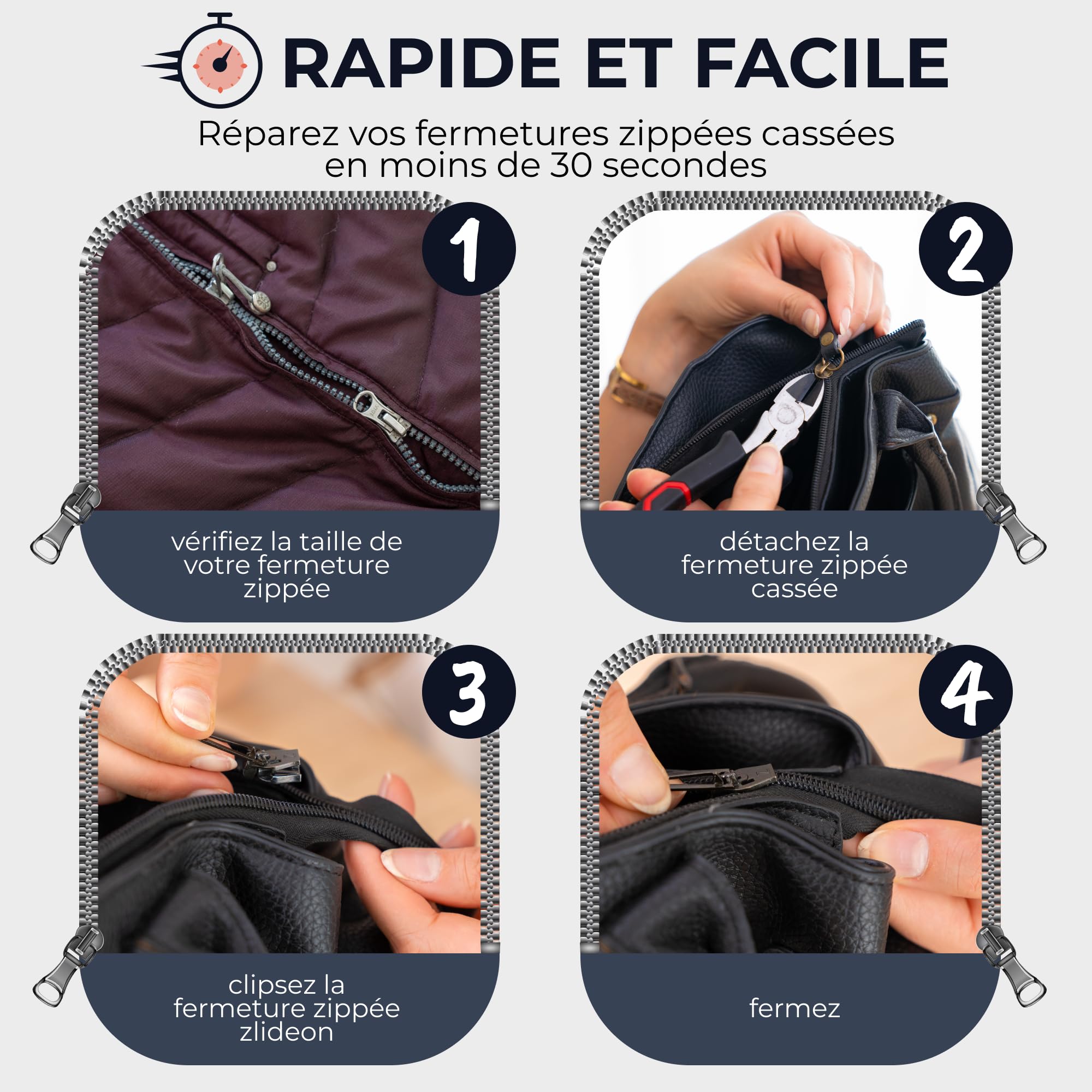 Fermetures à glissière métalliques. Fermeture à glissière réaliste en Kit Fermeture éclair étroite Zlideon Kit Universel De Réparation De Fermeture Éclair Pour Fermetures En Plastique Et En Métal - Lot De 3 Pièces, Noir (L) | Curseur De Remplacement Instantané Pour Denim | Fabriqué En Fermetures Eclair Fermetures à glissière incluses dans le multipack : Pour les fermetures à glissière étroites : XS (3CB) ; M (45C) ; L (5C) ; XL (8C) Zlideon – Curseur de Remplacement Clipsable pour Fermeture Éclair | Réparez Facilement Vos Fermetures Éclair en Quelques Secondes Ne remplacez plus vos vêtements, sacs ou valises à cause d’un curseur cassé – réparez-les en un clic avec Zlideon, la solution intelligente et rapide pour toute réparation de fermeture éclair. Il est idéal comme kit réparation fermeture éclair valise, vêtement de sport, ou pour fermeture éclair imperméable (étanche). Fermeture à glissière universelle Fix Kit de répar... – Grandado Le zip remplacement fermeture éclair est réutilisable, ce qui fait de lui un excellent choix durable et économique. Réparez rapidement vos fermetures éclair avec le kit Zlideon. Compatible avec la plupart des fermetures endommagées, il fonctionne même sur celles avec... Contenu du pack : 1 ou plusieurs curseurs Zlideon clipsables (selon la variante choisie) Instructions simples pour un montage immédiat Compatible avec tous les supports de glissière pour fermeture éclair Utilisé pour : Réparation fermeture éclair YKK Remplacement curseur fermeture éclair 5 mm Fermeture éclair pantalon, veste, tente, bottes, sacs, valises, canapés Curseur fermeture éclair clipsable XXL, XL, 5mm, 5C2, 5V, 10 Zlideon est le kit de réparation fermeture éclair le plus rapide du marché. Compatible avec : Fermeture éclair métal, plastique ou spirale Curseur 5C2, 5V YKK, XL, XXL Fermeture éclair étroite ou XL pour pantalon, veste, valise, tente, sac à dos, bottes, canapé Double zip / double curseur Tirette de rechange incluse dans les kits Robuste et Durable : Fabriqué en métal de haute qualité, le curseur fermeture éclair Zlideon XL métal est conçu pour les usages intensifs.