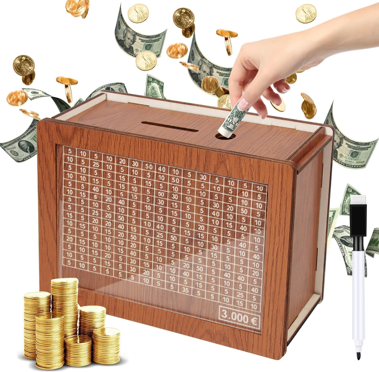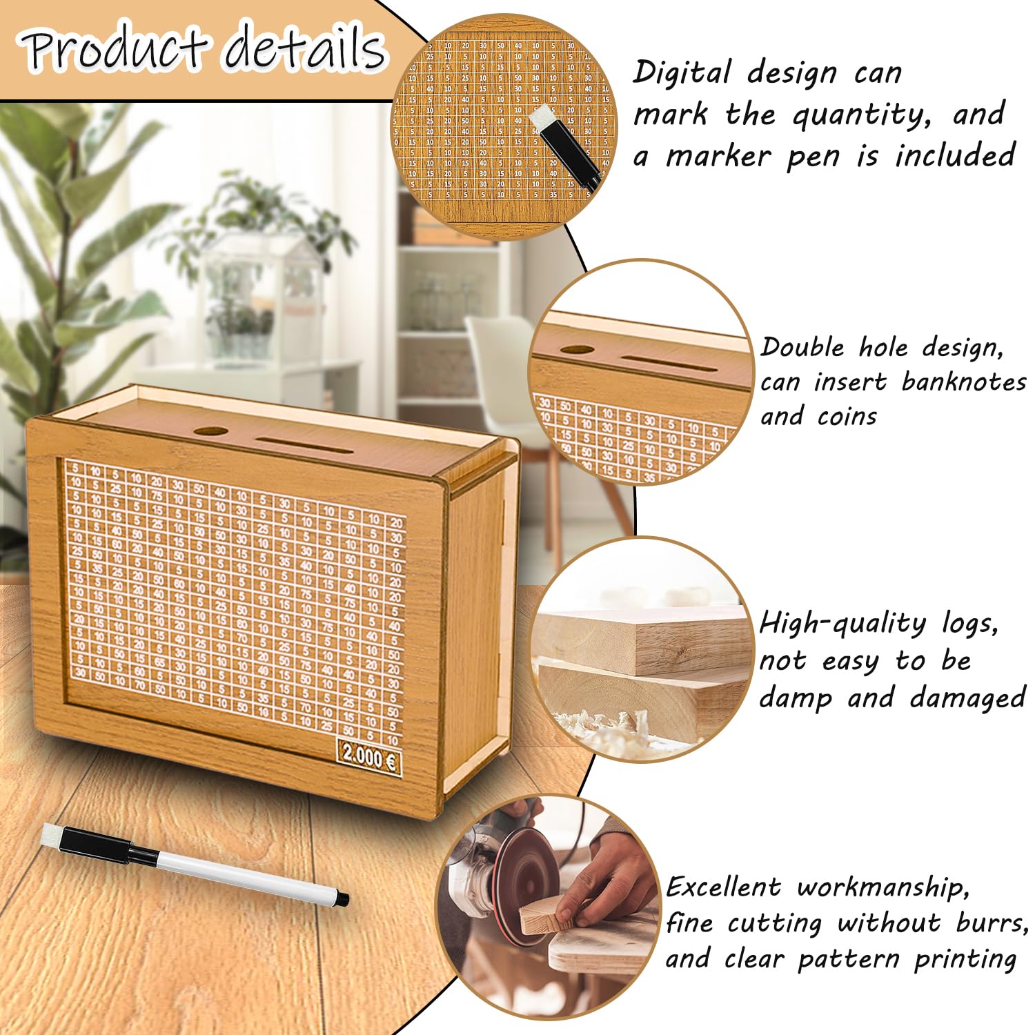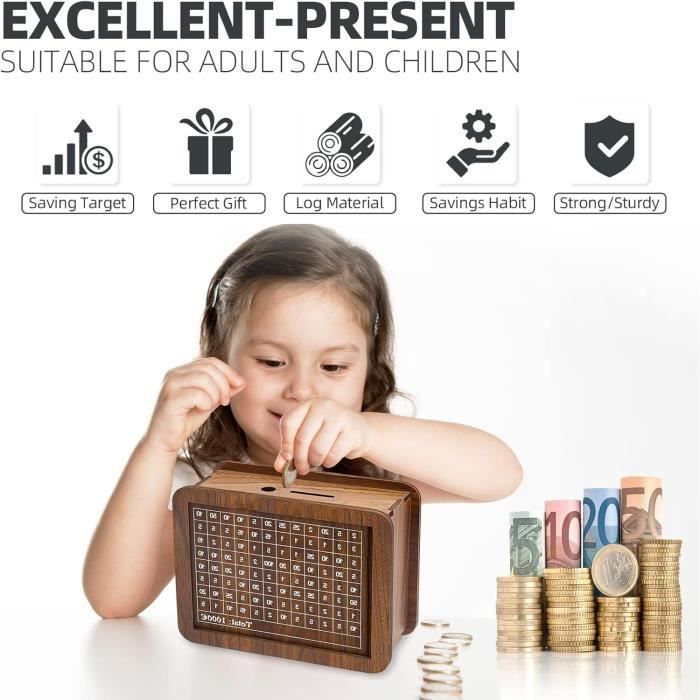 Tirelire pour Objectif D'économie:La Tirelire avec Objectif imprimée avec différents montants numériques a des trous spéciaux pour les pièces et les billets, vous devez déposer le montant sur la case et cocher le montant, vous aide à vous motiver pour des objectifs particuliers ★En raison de la différence de réglage de la lumière et de l'écran, la couleur de l'élément peut être légèrement différente de celle des images. Cette tirelire en bois réutilisable est dotée d'un compteur numérique et de cases pour cocher vos objectifs d'épargne. Idéale pour motiver les enfants à économiser, elle est conçue pour accueillir pièces et billets Matériaux de qualité:Tirelire en Bois avec Chiffres faite de matériaux en bois sélectionnés de haute qualité, solide, durable, pas facile à casser ou à déformer, et avec plaques acryliques Facile à assembler:Pour éviter la casse pendant le transport, Cette Tirelire en Bois expédiée dans un état démonté. Tirelire en Bois, Numérique Tirelire, Tirelire Réutilisable, avec Marqueur (5000 L'assemblage est très simple(avec vidéo de montage) , aucun outil requis, mais peut être installé en quelques minutes en épissant simplement les trous appropriés, puis en l'utilisant Cadeau parfait:Tirelire avec Compteur non seulement être utilisée comme tirelire, mais peut également être placée dans le salon comme décoration,C'est une excellente idée de cadeau pour les anniversaires, les vacances ou toute autre occasion spéciale Tirelire éducative Cadeau Enfant Tirelire/banque De Monnaie, Réutilisable, En Bois, Avec Compteur, Objectif D'épargne De 5000 Tirelire Réutilisable Compteur Matériaux de Haute Qualité:Fabriquée en boisde haute qualité, cette Tirelire en Bois est durable et incassable, plus solide et plus sûre, Apparence à la mode, adaptée aux personnes de tous âges Description du Produit Tirelire en Bois, Tirelire Réutilisable avec Stylo Effaçable, Tirelire avec Compteur, Tirelire avec Objectif D'épargne et Chiffres à Cocher, pour Aider Les Enfants à Commencer à Economiser Caractéristiques: 1., La Tirelire avec Compteur trous spéciaux pour les pièces et les billets, et le montant de l'objectif d'épargne rend l'épargne facile et amusante, comme battre des niveaux., 2., Tirelire Réutilisable avec Stylo Effaçable Vous pouvez également griffonner ce que vous voulez sur la, comme un nom ou un souhait d'anniversaire., 3., Cette Tirelire avec Objectif D'épargne et Chiffres à Cocher n'est pas seulement un cadeau inoubliable pour la famille et les amis, mais peut également être placée sur un plateau de table comme décoration. ★Le forfait comprend:1 * Tirelire en bois1 plaque d'écriture transparente1 * Stylo Soluble Dans L'eau.