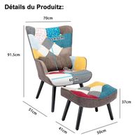 【DURABLE ET SOLIDE】Ce fauteuil scandinave et tabouret multicolore est composé d'une structure en bois massif et d'une éponge douce. Fauteuil Patchwork Repose-pieds Fauteuil Scandinave Avec Repose Pieds En Tissu Gris Anthracite - LIV | ID Market Chaise Avec Repose-pieds Imaginez que vous lisiez des poésies de Charles BAUDELAIRE pendant l’après-midi en tout baignant dans les lumières du soleil, café chaud corsé à côté, c’est vraiment la meilleure expérience du monde! Aussi, cela montre une bonne longévité. Vous pouvez vous appuyer là dessus et vous asseoir sur chaise de sorte que vous ne vous sentirez pas fatigué après une longue période d’assise. Largeur d'assise : 44cm Pendant ce temps, le siège profondément rembourré et le dossier ergonomique offrent un confort supplémentaire. Avec la conception curvée sur la surface, les pieds seront mieux reposés. STELLA - Chaise scandinave tissu patchwork rouge pieds hêtre (x1 Lot de 2 Chaises de Salle à Manger en Tissu Patchwork avec Accoudoirs, Fauteuil Design Moderne, Chaise de Cuisine Scandinave en Bois de Hêtre (Noir Blanc Gris Merci beaucoup pour votre confiance et votre commande. Le décor en touffe en composant le tissu patchwork est bien stylé. Venez avec moi pour le connaître plus! CHAISE CONFORTABLE ET ERGONOMIQUE POUR LA MAISON Cette chaise longue en patchwork d'inspiration scandinave rétro donne une ambiance relaxante et paisible à votre maison. Les chaises sont très polyvalentes et peuvent être utilisées dans une variété de combinaisons. De plus, en tenant compte d’un confort maximal, il est équipé d’un pouf correspondant à la hauteur faisant confortable du corps humain. 【DESIGN MODERNE】 Le design rétro en tissu patchwork coloré fait de ce fauteuil patchwork la décoration la plus accrocheuse de votre salon, chambre et salon. Si vous recevez des dommages ou des défauts avec notre produit, n'hésitez pas à contacter l'équipe de service, nous vous répondrons dans les 12 heures. C'est définitivement une excellente fauteuil d'appoint pour un moment de détente. Ce fauteuil relaxant au style SCANDINAVE rétro en tissu patchwork crée une ambiance détendue et pacifique à la maison. Tapis de Pieds réglables Il est muni des tapis sous les pieds pour vous assurer un réglage au cas où vous trouvez la chaise non stable sur le sol. Dossier Plein La hauteur du dossier peut soutenir votre cou et vous pouvez reposer votre cou dessus pour vous détendre. C'est certainement une bonne décoration pour votre salon, chambre, salle à manger, balcon et bureau. 【BOIS PRÉCIEUX】 La structure de ce fauteuil de salon avec repose-pieds est en bois et fin, qui est solide et ne se déforme pas facilement. Fauteuil patchwork en tissu avec repose pieds – Stockhol Profondeur d'assise : 49cm , Hauteur dossier : 60cm En même temps, l'assise et le dossier sont recouverts de mousse à haute résistance, associée à un tissu en lin doux et à des coutures solides pour plus de confort.