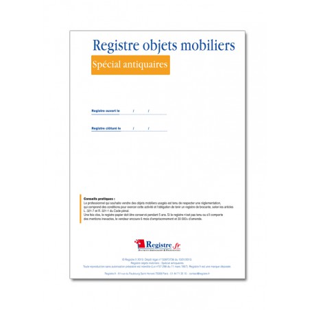 Registre Brocanteurs-Antiquaires - Papeterie Financière Livre de Police Brocanteur Antiquaire Registre des Objets Mobiliers Spécial Brocantes, Friperies, Dépôts Ventes, Vide-Greniers et Garagistes 120 pages NLFBP Editions - broché - NLFBP Editions - Achat Livre ELVE Registre d'Objets Mobiliers pour Antiquaires Registre d'Objets mobiliers. Obligatoire pour antiquaire, brocanteur, négociant, etc. Registre relié et toilé. 100 pages numérotées. Format : 320 x 250 mm...