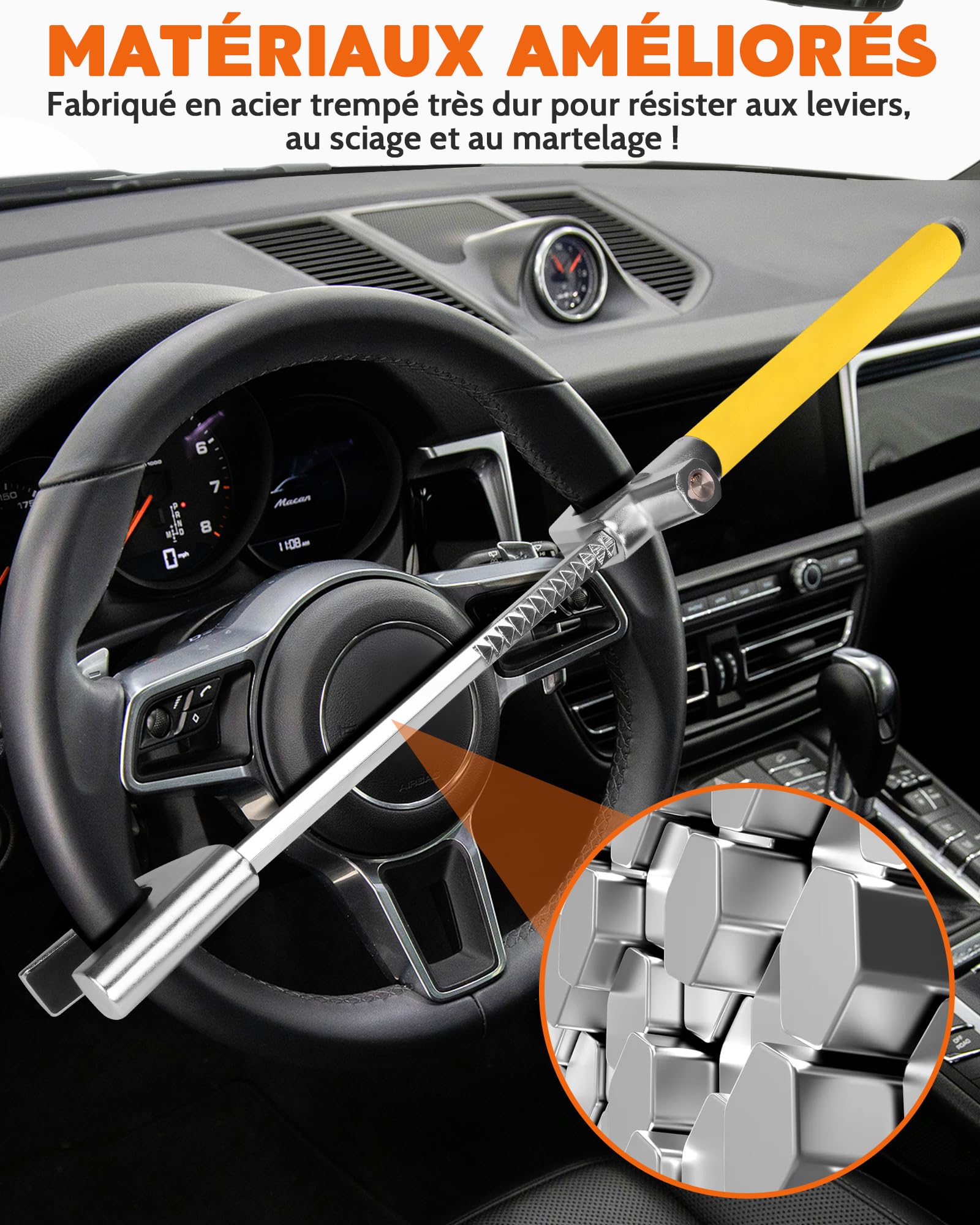 Tevlaphee Antivol Voiture, Canne Antivol Voiture, Bloque Volant, Barre Auto Pro Antivol Tevlaphee Bloque-Volant, Serrure De Sécurité Auto, Dispositif Anti-Vol Robuste, Haute Visibilité, Adaptation Universelle Pour Voitures, SUV & Vans, Réglable, Noyau En Acier Massif, 3 Clés(Noir Bloque Volant Voiture Sérénité assurée à chaque stationnement. 🔐【Structure Robuste en Acier Alliage】Fabriqué en acier allié haute résistance, cet antivol de volant offre une excellente résistance au sciage, au perçage et au forçage. 🔐【Conception à Barre Unique Épaisse avec 4 Crochets】Une barre centrale renforcée combinée à 4 crochets offre une fixation ferme et sécurisée sur plusieurs points du volant. Compatible avec les volants jusqu'à 41,5 cm, il est réglable jusqu'à 78 cm. Sa finition jaune dissuade les voleurs et il est livré avec 3 clés pour plus de sécurité Il est entouré d'un boîtier en alliage d’aluminium robuste pour une sécurité renforcée. La canne antivol pour volant de voiture Tevlaphee est un dispositif ingénieux conçu pour assurer la sécurité de votre véhicule. Ce produit se démarque par son efficacité et sa robustesse Barre télescopique réglable jusqu’à 78 cm pour une installation rapide et facile. Le revêtement en PVC protège votre volant des rayures tout en assurant une durabilité maximale.