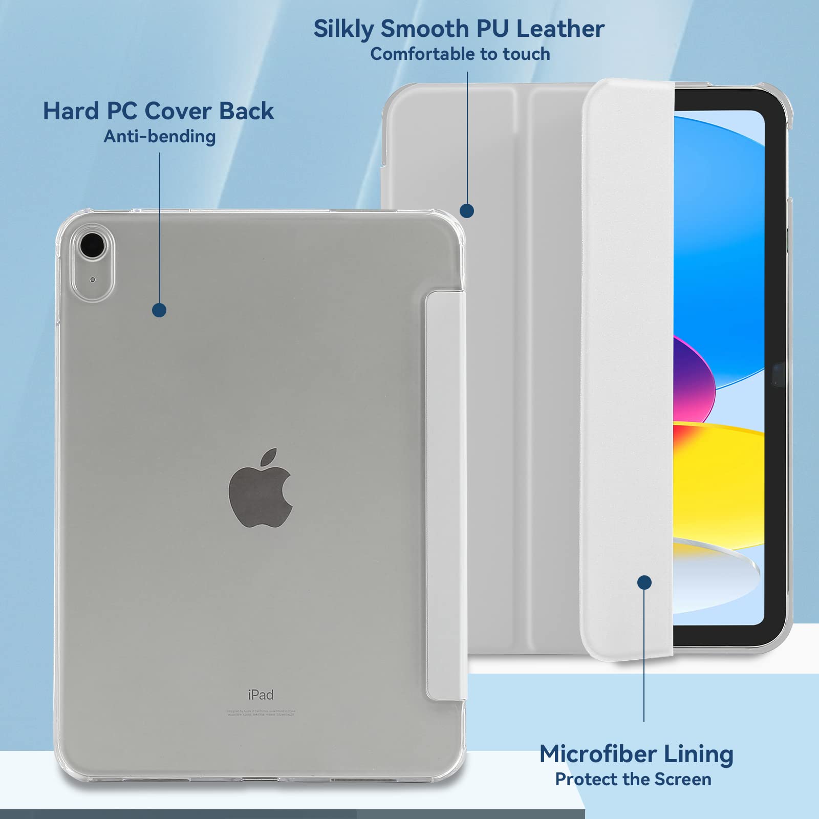 Le dos translucide givré protège contre les empreintes digitales et les rayures, il montre également la beauté originale de l'iPad. Coque arrière givrée flexible en TPU translucide La coque arrière dépolie translucide le rend résistant aux rayures, antidérapant et anti-fingerprints. it montre également la beauté originale de vos appareils. Vous pouvez avoir les mains libres pour regarder des films et utiliser confortablement le clavier. Découpes Précises & Mode Double Support : conçu avec des découpes précises, il vous permet d'accéder facilement à toutes les fonctions importantes, sans retirer la coque. Coque IPad A16 11ème Génération 4UBonLife Coque Pour IPad A16 11ème Génération 11 Pouces 2025, IPad 10ème Génération 10,9" 2022, Légère Et Fine Étui Housse De Protection, Coque En PC Dur Arrière Translucide Givré, Gris Lavande Coque IPad Support Magnétique Auto Reveil Il permet de garder votre crayon relevé et à portée de main à tout moment. Les 3 plis de la partie frontale vous permettent de transformer facilement l'étui en support de visualisation ou en support de clavier. Mode de support de visualisation mains libres Lorsque vous ouvrez ou fermez l'étui, le capteur magnétique intelligent réveille ou met en veille automatiquement votre iPad. Étui de Protection Complet: Fait d'extérieur en cuir PU lisse et soyeux, intérieur en microfibre et coque de couverture arrière de PC rigide, protégez vos appareils contre les rayures, les chocs, les chutes et les impacts Protection intégrale : extérieur en cuir synthétique durable, qui offre une sensation soyeuse au toucher, doublure en microfibre et coque arrière en TPU souple pour protéger votre tablette contre les chocs, les chutes et les impacts. Mince et portable : Conception ultra-mince et légère pour une portabilité sans effort, parfaite pour un confort en déplacement sans ajouter de volume. Auto Réveil/Sommeil: le front de l'étui de protection est doté d'une bande magnétique intégrée. Protection de l’écran et de l’appareil photo Excellente Qualité : Notre étui pour iPad 11e génération 11 pouces / 10e génération 10,9 pouces (2025/2022) est fabriqué en cuir PU premium à l'extérieur, avec une doublure en microfibre douce et une coque arrière translucide en PC, offrant une protection complète pour votre précieuse tablette iPad 11ème génération Page 2 - Achat Informatique Les coins de protection d'air absorbent les chocs, garantissant ainsi que vos appareils restent intacts.